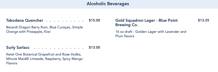 It’s also worth noting that there’s a new cocktail on the menu. Previously, you could only get the Takodana Quencher here. Now there’s also a Surly Sarlacc drink featuring Ketel One Botanical Grapefruit and Rose Vodka, Minute Maid Limeade, Raspberry, and Spicy Mango Flavors. And it’s $2 cheaper than the Quencher. (See, not all change is bad…)