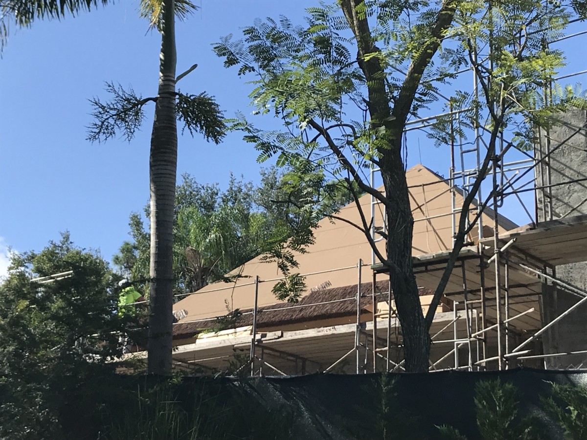 The first row of roof thatching was installed. This will match the other roofs in the surrounding area.