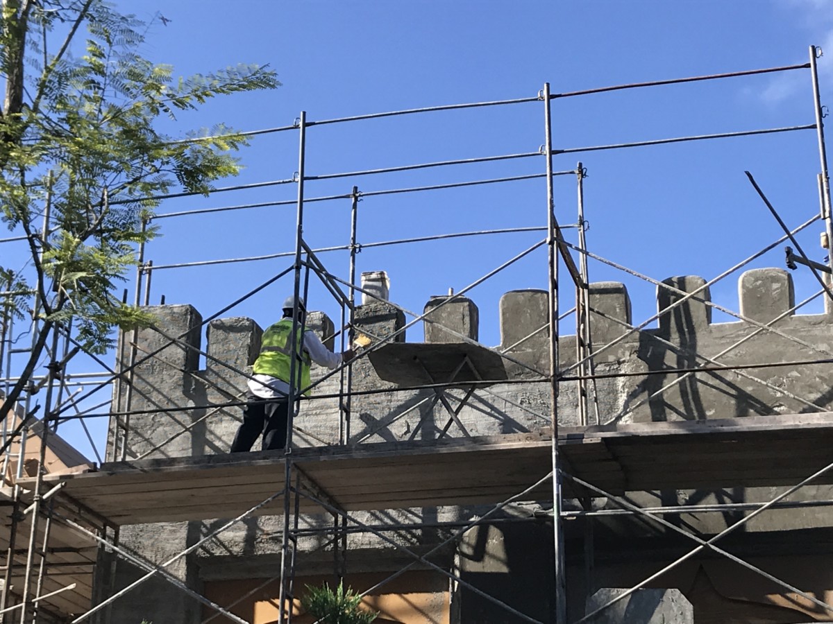 We spotted a contractor slinging extra compound onto the exterior walls to add extra texture for a lived-in, weathered feel.