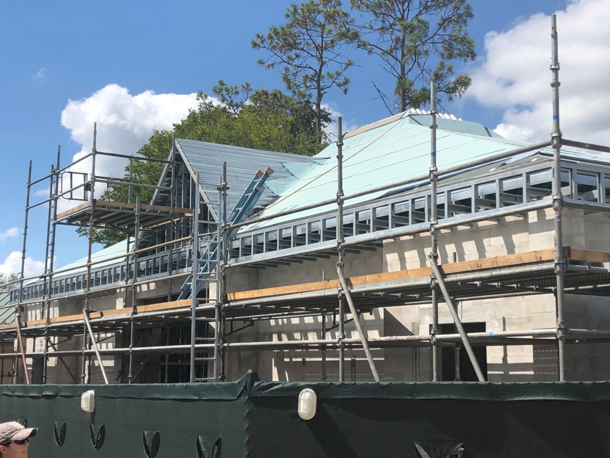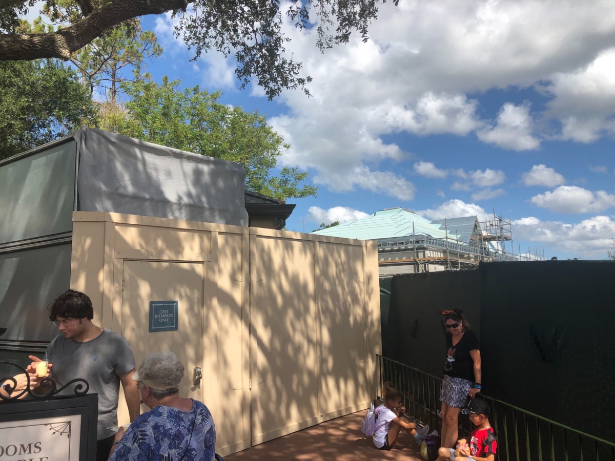 The new restrooms are coming along quickly, and the old restrooms by Refreshment Port are closed to guests now. There’s a temporary wall around the old entrance.