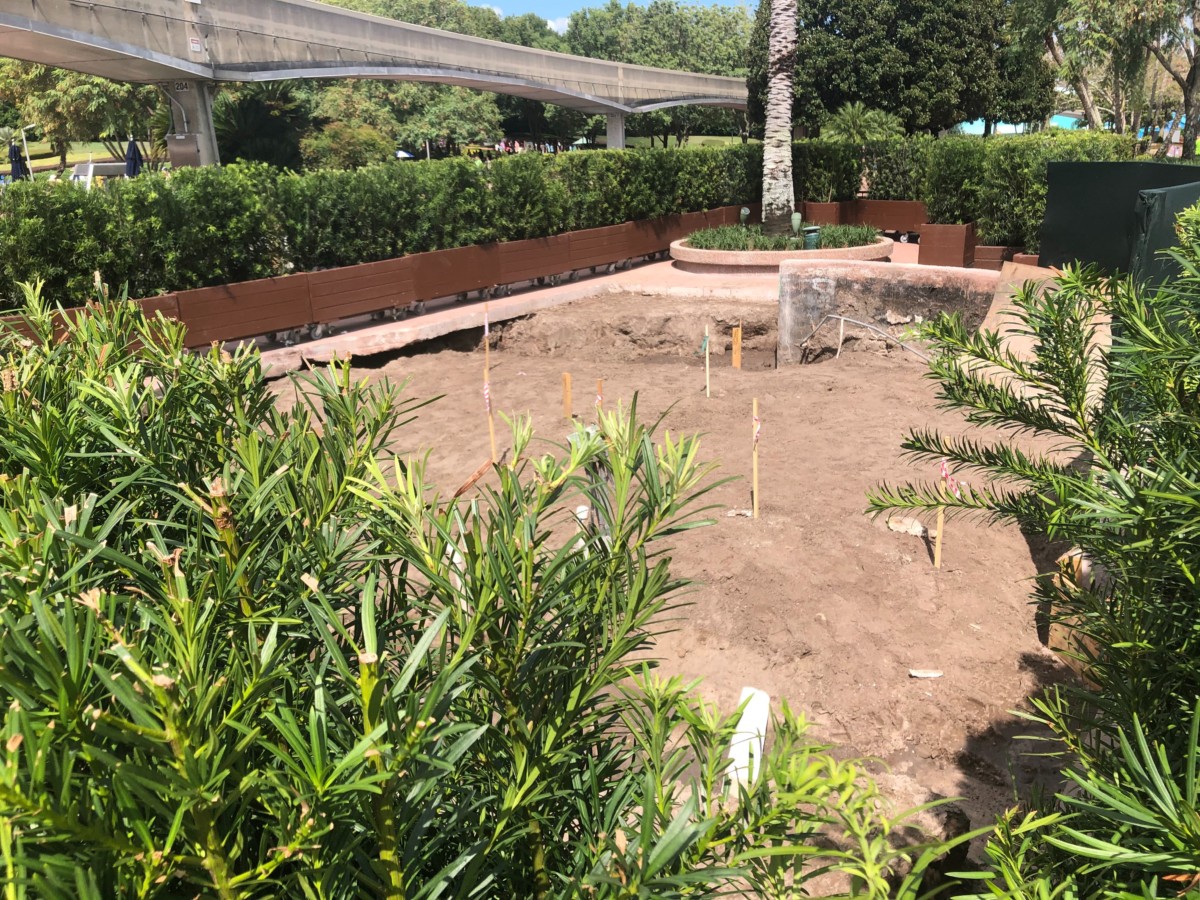 There are bushes taking up a large section of pathway by the Imagination Pavilion. We can see the ground is torn up through the bushes.