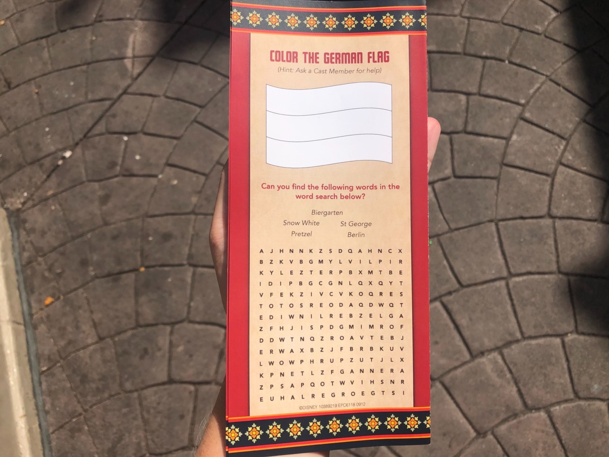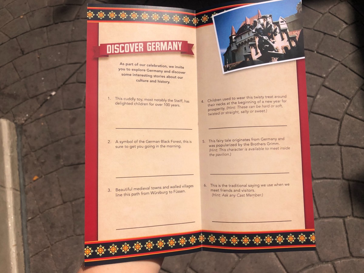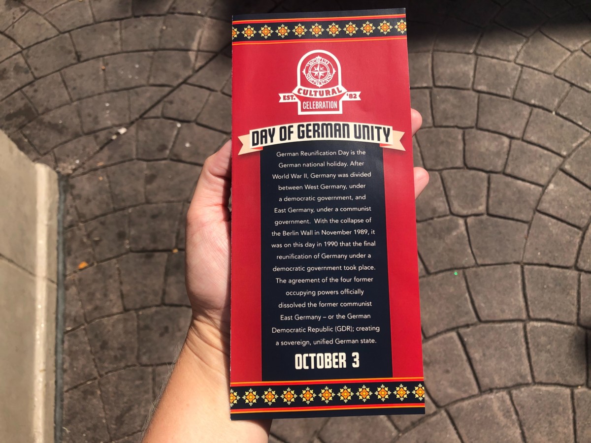 October 3rd is German Reunification Day, and Cast Members have a small pamphlet of trivia questions and games. The history of the holiday is written on the front, which I really appreciated. It’s nice to see something unique like this while traveling through World Showcase.