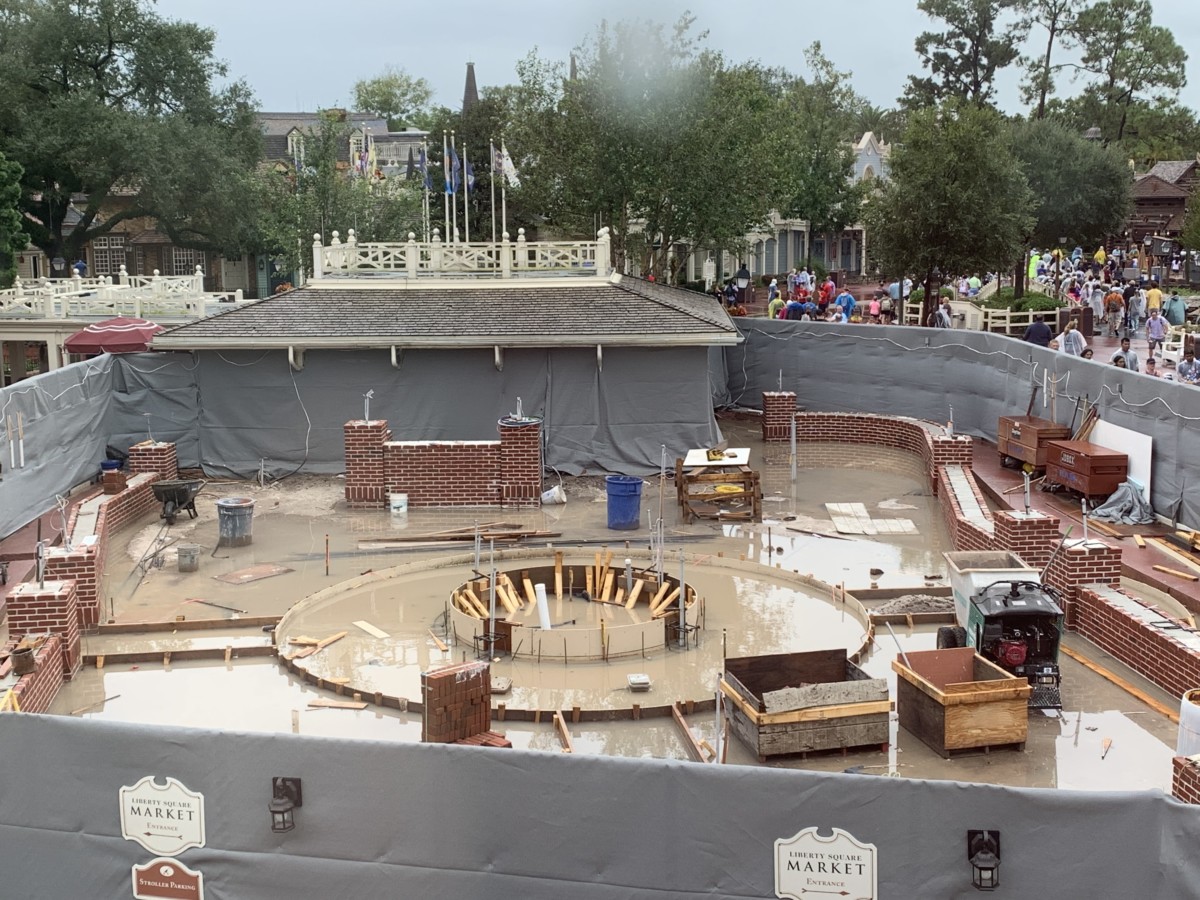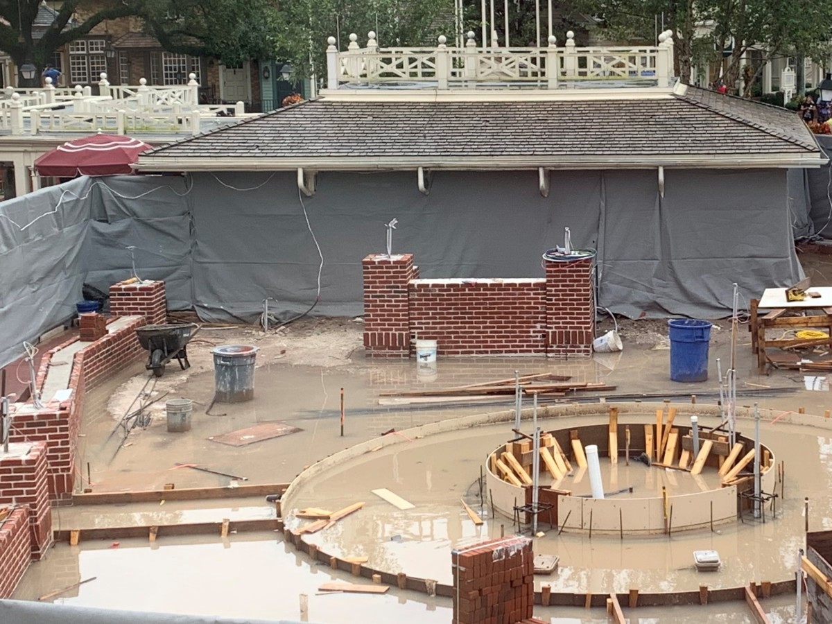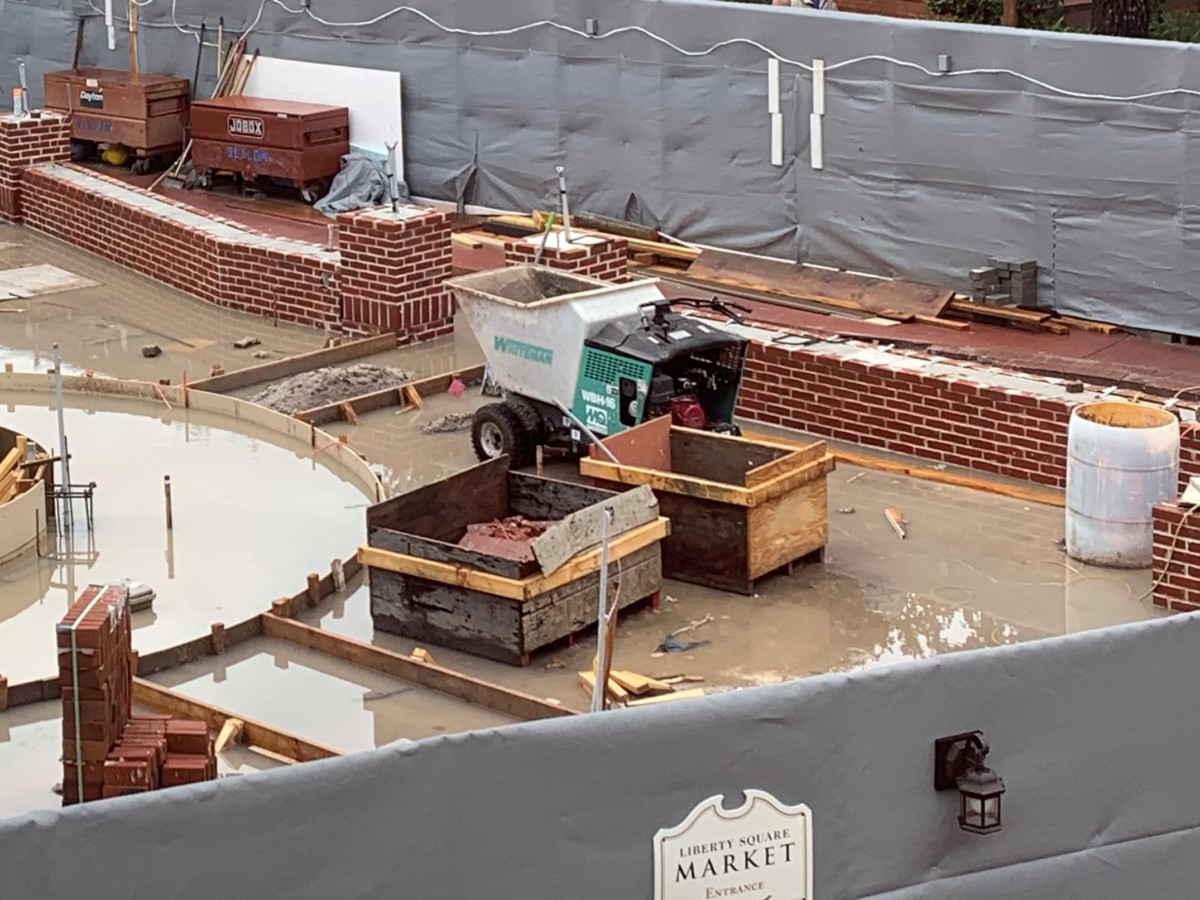 The center seems to point towards some sort of fountain being installed, which would be a nice addition, however, it may be the base for a large planter, similar to what was there before the demolition. The brickwork that surrounds the perimeter also seems to fully line the seating area now, a big difference from our last visit.