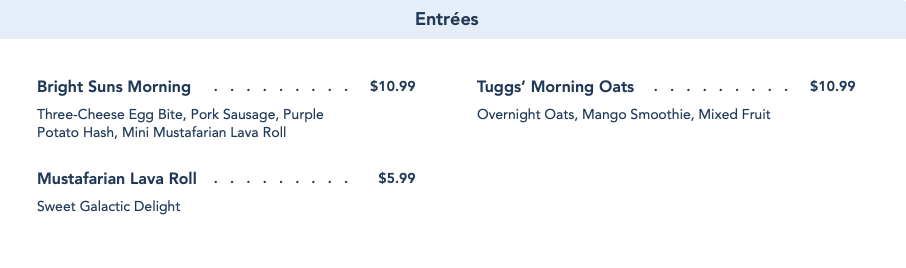 Here’s a look at the current online menus on Walt Disney World’s Docking Bay 7 landing page: