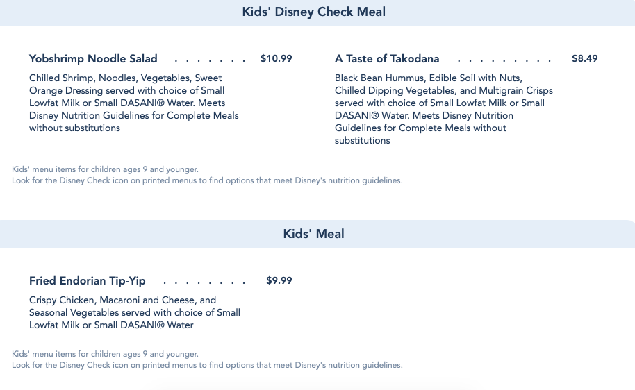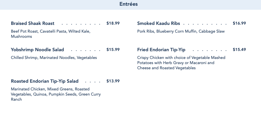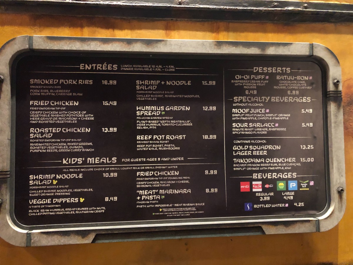 Since its opening, the menu at the land’s main quick-service eatery included names like Smoked Kaadu Ribs and Fried Endorian Tip-Yip, adding to the theme of Star Wars: Galaxy’s Edge. Overnight, all of those names were switched over to plainly state what each menu item was. For example, Fried Endorian Tip-Yip was simplified to “Fried Chicken”, the Shaak Roast became simply a “Beef Pot Roast”, and the Yobshrimp Noodle Salad was now a “Shrimp & Noodle Salad.” Even the Felucian Garden Spread was renamed to just a “Hummus Garden Spread”.