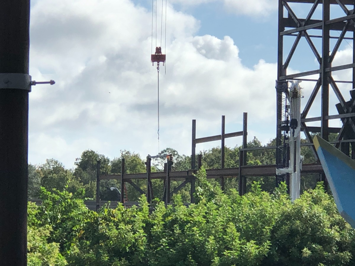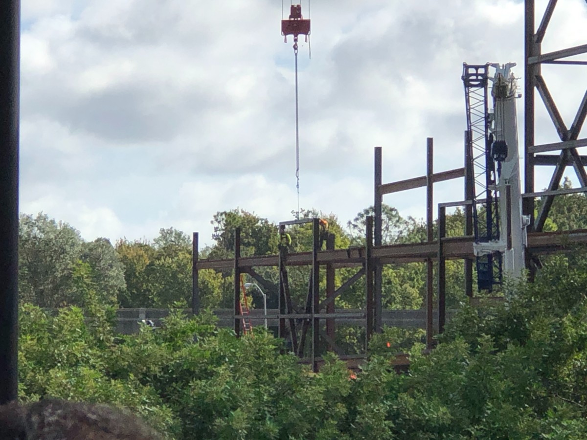 From what we can tell, the show building seems to be expanding outwards on one side. We can see a crew guiding new beams in place on a lower level area.
