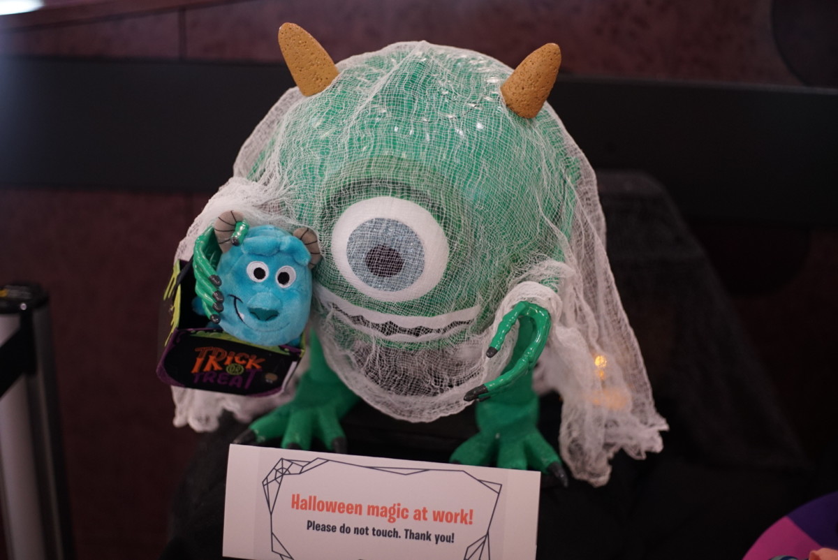 The beloved one-eyed monster, Mike Wazowski, has donned ghoulish attire in hopes of scoring some treats. A miniature Sully is along for the ride inside Mike’s treat bag.