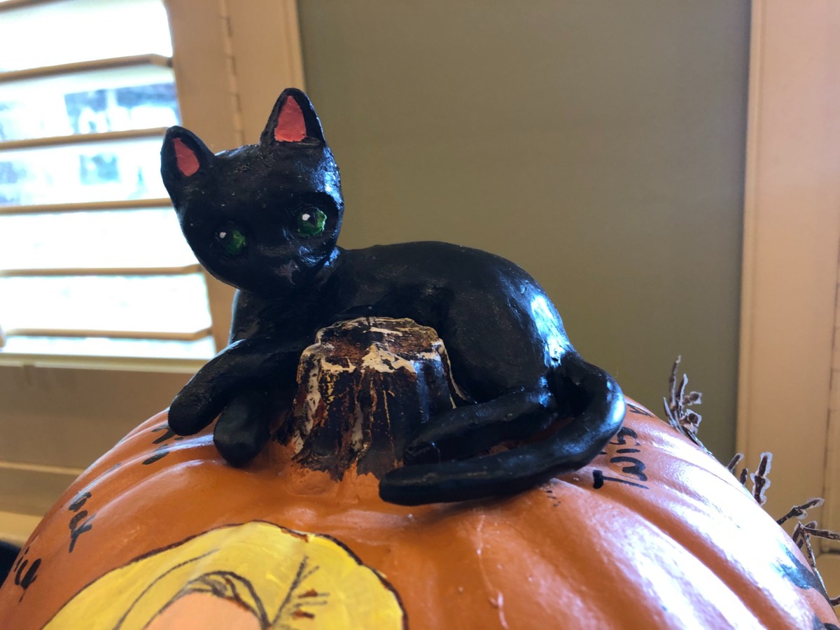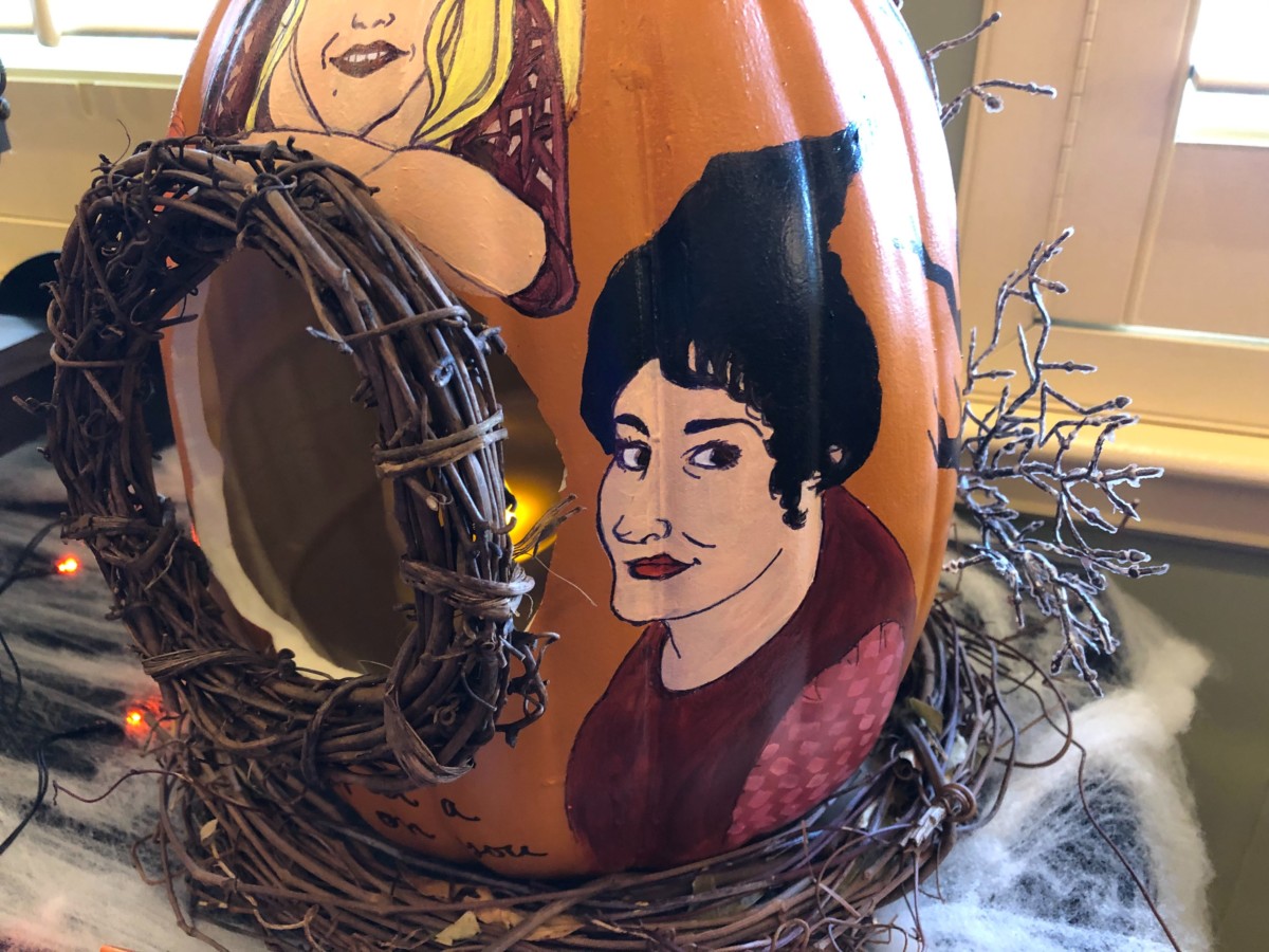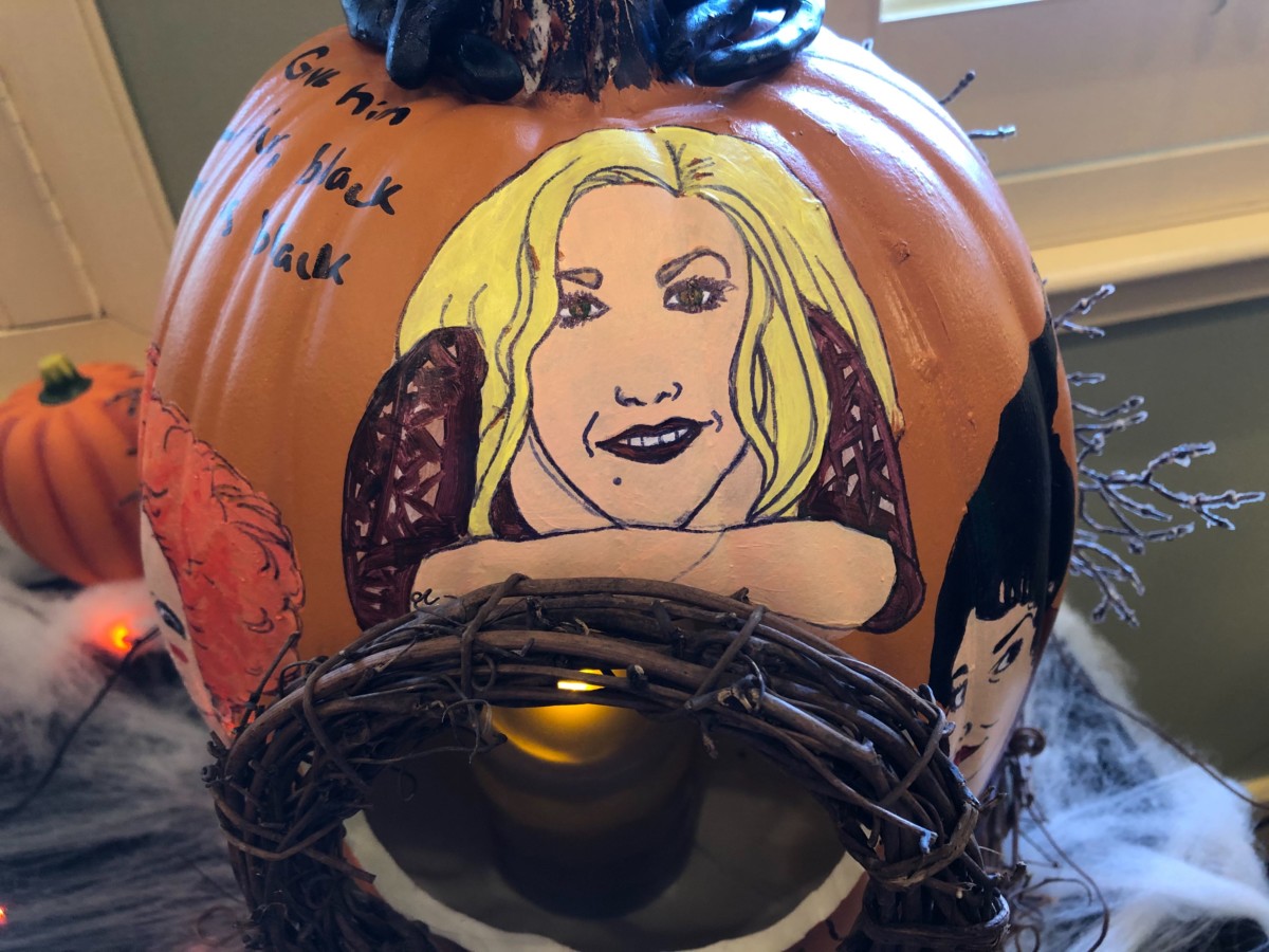 It’s just a bunch of Hocus Pocus. The Sanderson Sisters decorate this pumpkin, topped by Binx, with the black flame candle inside.