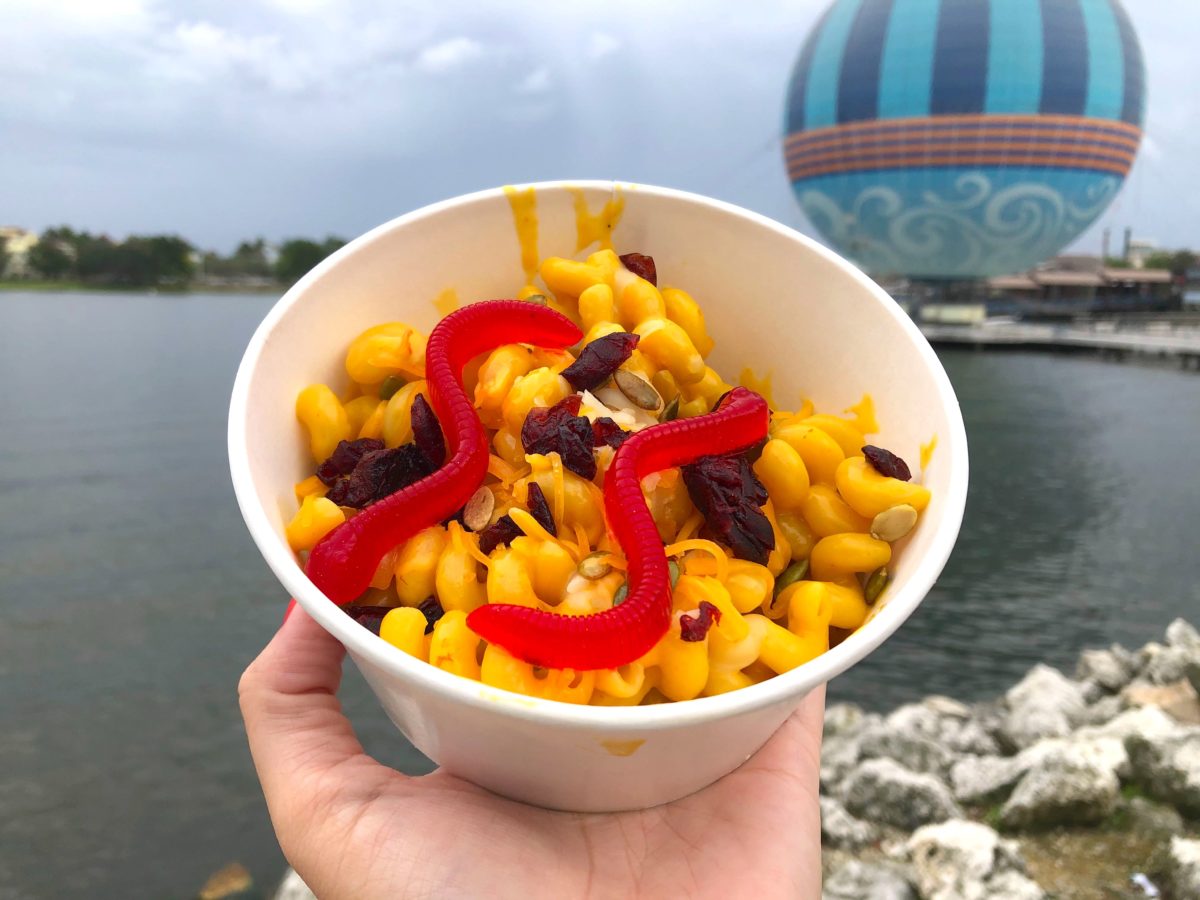 Halloween is less than a week away and Disney Springs is celebrating with frightful eats at three of their Food Trucks, located in Food Truck Park across from the AMC Theaters. We’re at the recently-opened Mac & Cheese Food Truck for their new Pumpkin Mac ‘n’ Cheese, complete with cranberry gummy worms… for a haunting touch.