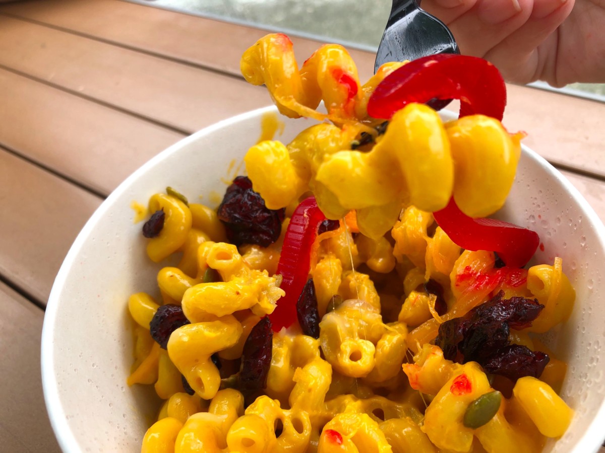 This mac and cheese comes tossed with robust pumpkin-cheese sauce, toasted pumpkin seeds, dried cranberries, and gummy cranberry worms.