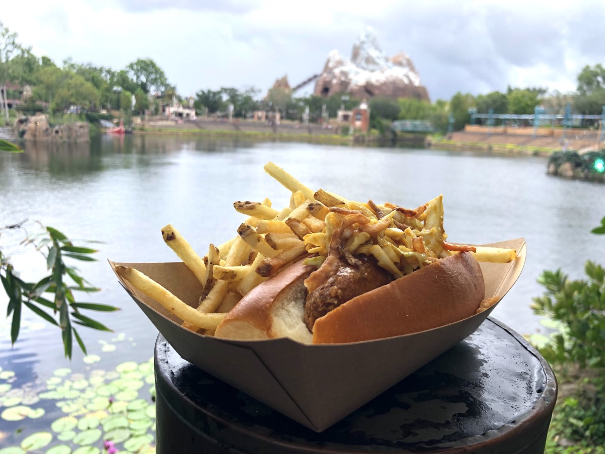 Today, we’re at Disney’s Animal Kingdom (because what better place to offer plant-based offerings than the crunchiest park on property) checking out all of the new vegan offerings. So far, we’ve surprisingly enjoyed the new Sicilian-Style Pizza Slice at Pizzafari. Next, we’re headed over to Flame Tree Barbecue for the only vegan entree on the menu: the Hot Link Smokehouse Sandwich!