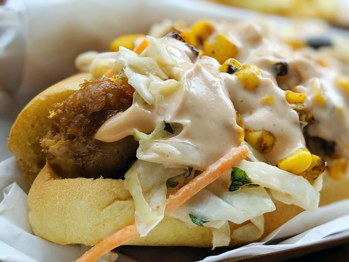 There are 3 different components that make this dish possible. First, we have the dog itself which is a Hot Italian Beyond Sausage by Beyond Meat. Next, we have the slaw, comprised of cabbage, white onions, fresh cilantro, shredded rainbow carrots, kale, corn, peppers, and BBQ vegan aioli. Finally, the dog is wrapped in a soft warm bun for completion.