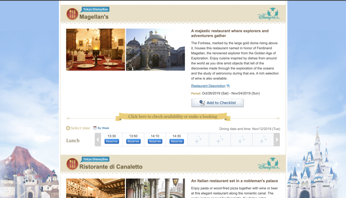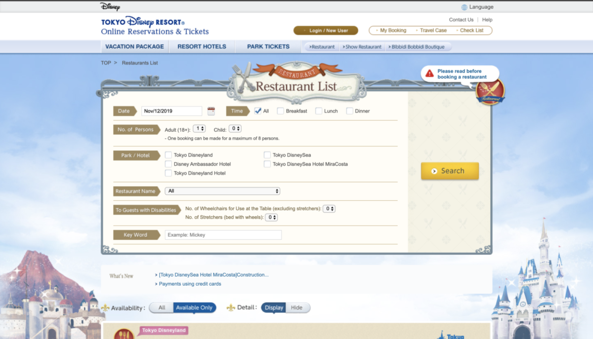 Fantastic news for foreign tourists to Tokyo Disney Resort! Until recently, the Tokyo Disney Resort Reservations website only offered English as an option for reserving hotel stays and buying tickets. Very recently, however, the Oriental Land Company has quietly added support in English for dining and dinner shows! Now a larger number of Guests can plan ahead for their Tokyo Disney Resort adventure without navigating Google Translate!