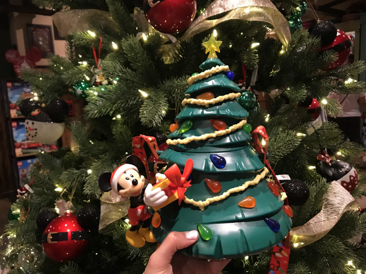 After obtaining these prized possessions (seriously… at least 15 people stopped us to ask were we got them), we scurried back over to Discovery Trading Company to snap some photos with the store’s Christmas trees. This Christmas Tree popcorn bucket includes a little Mickey wearing a Santa hat and bearing a gift. The garland wrapping the tree is made of rubber in contrast to the rest of the tree’s sculpted plastic. This particular bucket is $25.00.