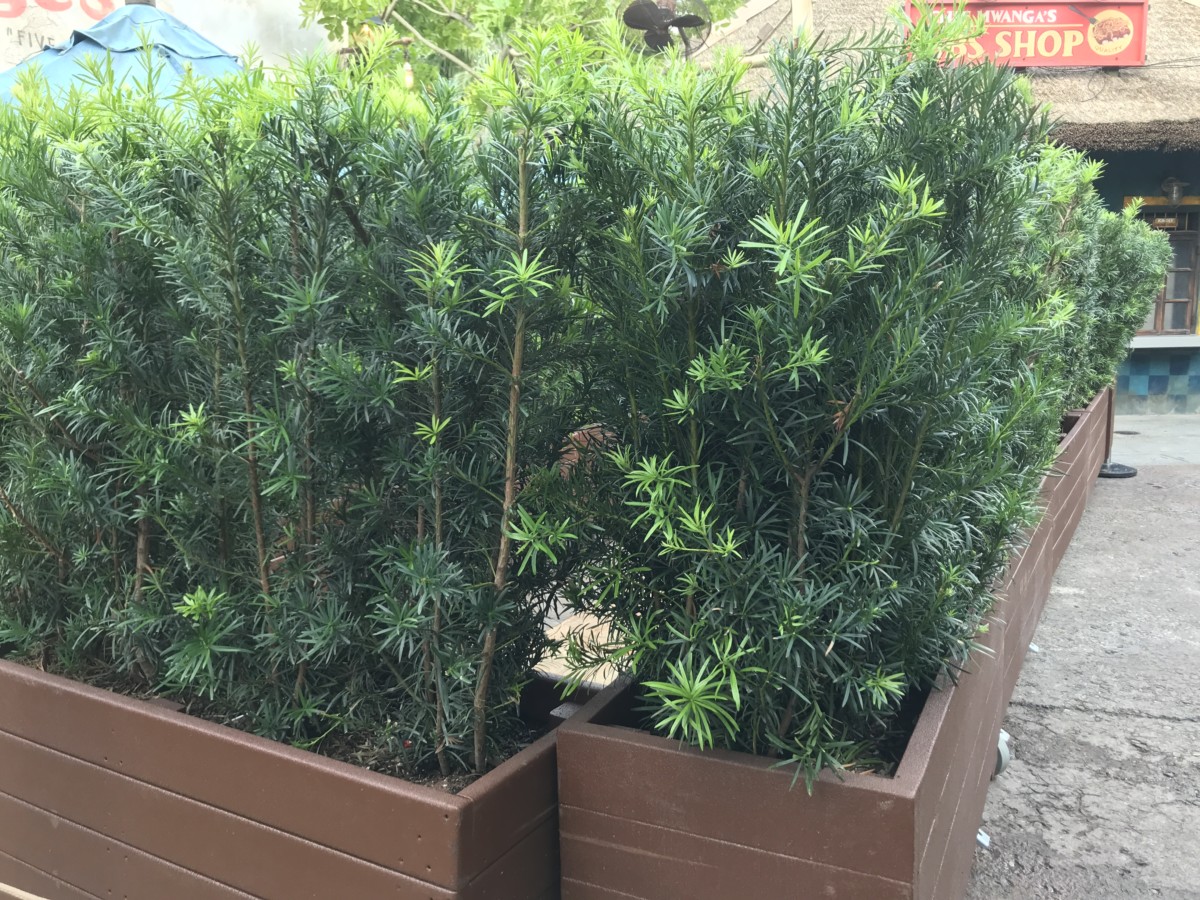 The hedges were concealing ongoing repair work on the market’s concrete walkway. Plywood was laying over the work area.