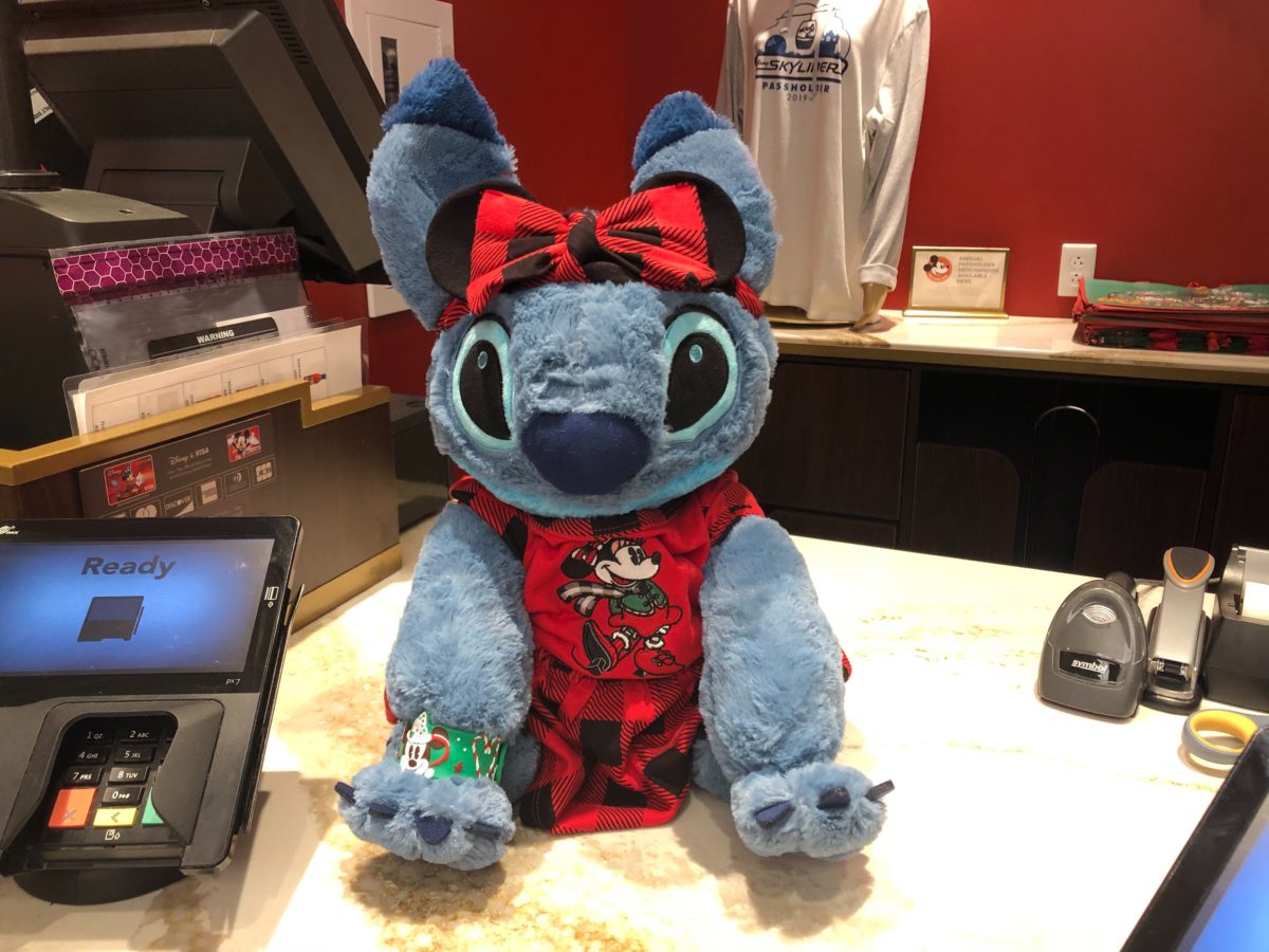 Stitch is ready for the holiday season in this cozy little outfit and slap bracelet. Several gift shops around the park have mascot Stitch plushes, and this one can be found in Mickey’s of Hollywood.