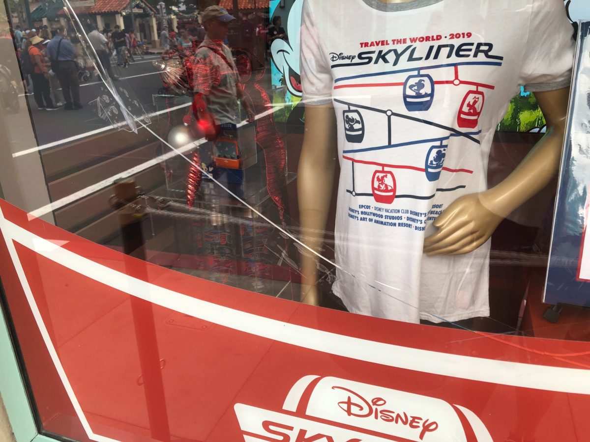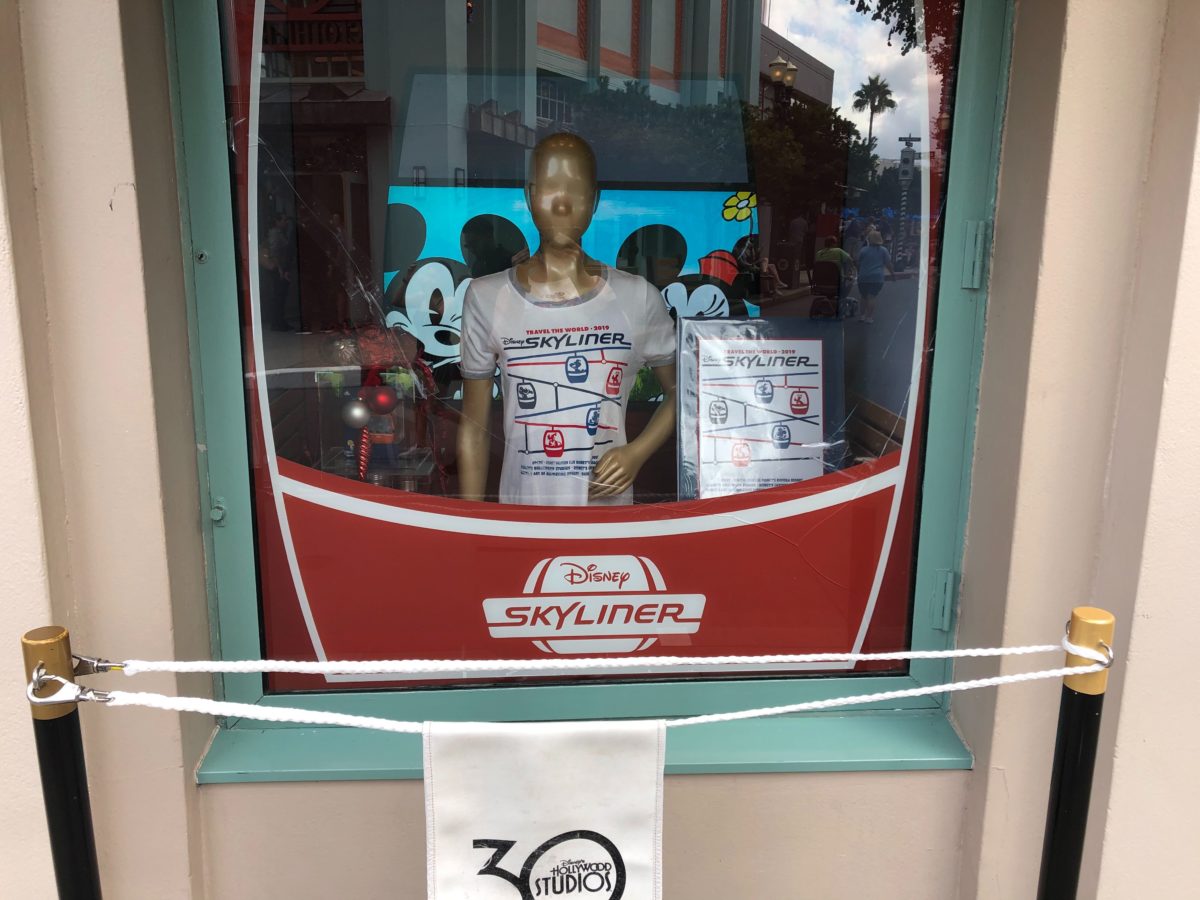 Three new window displays have been installed outside of Mickey’s of Hollywood featuring the Disney Skyliner. Unfortunately, one of the windows is experiencing some “unplanned downtime.” The cracked window is currently patched up with tape.