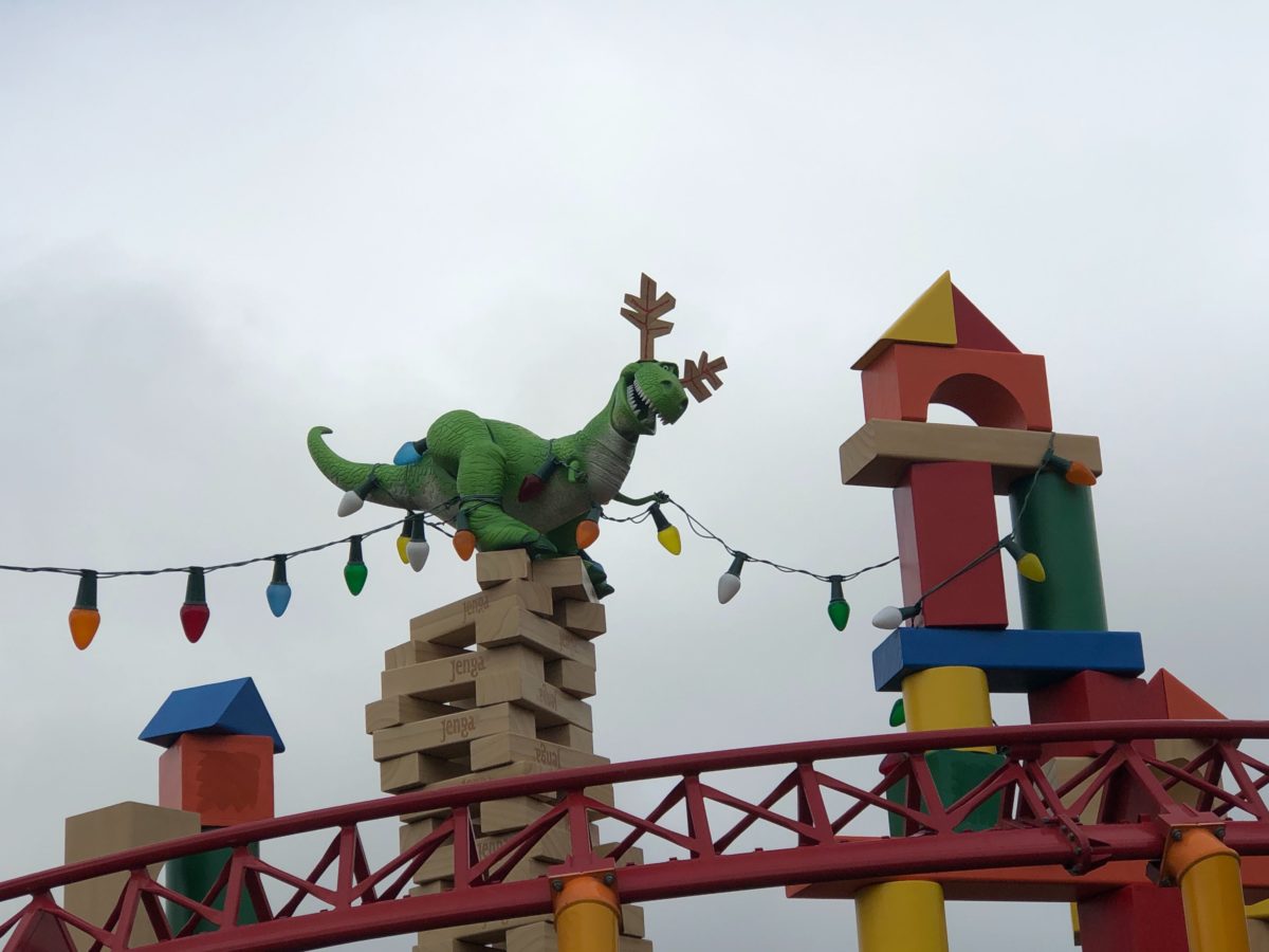 You’ll have to look up to spot Rex. He looks so cute in his reindeer antlers up along the track for Slinky Dog Dash.