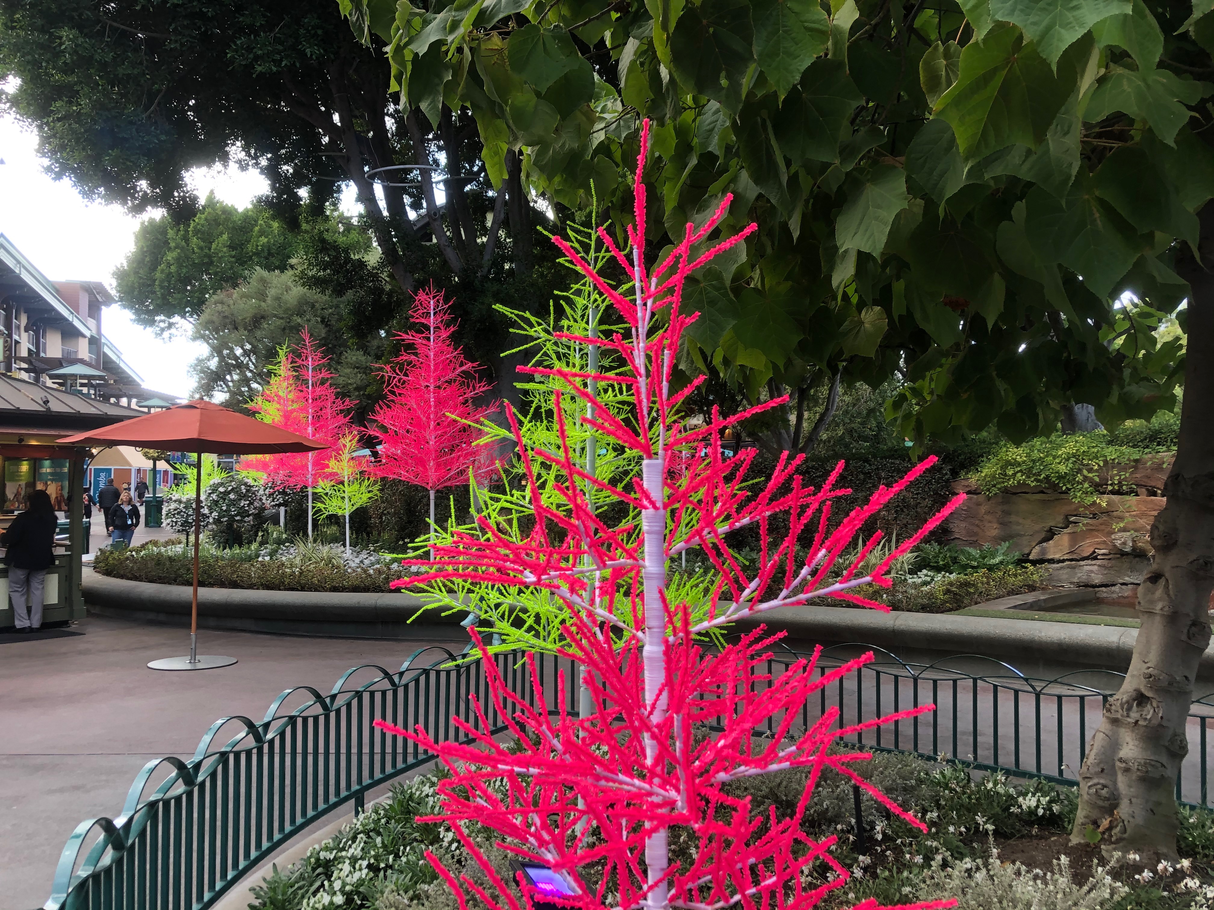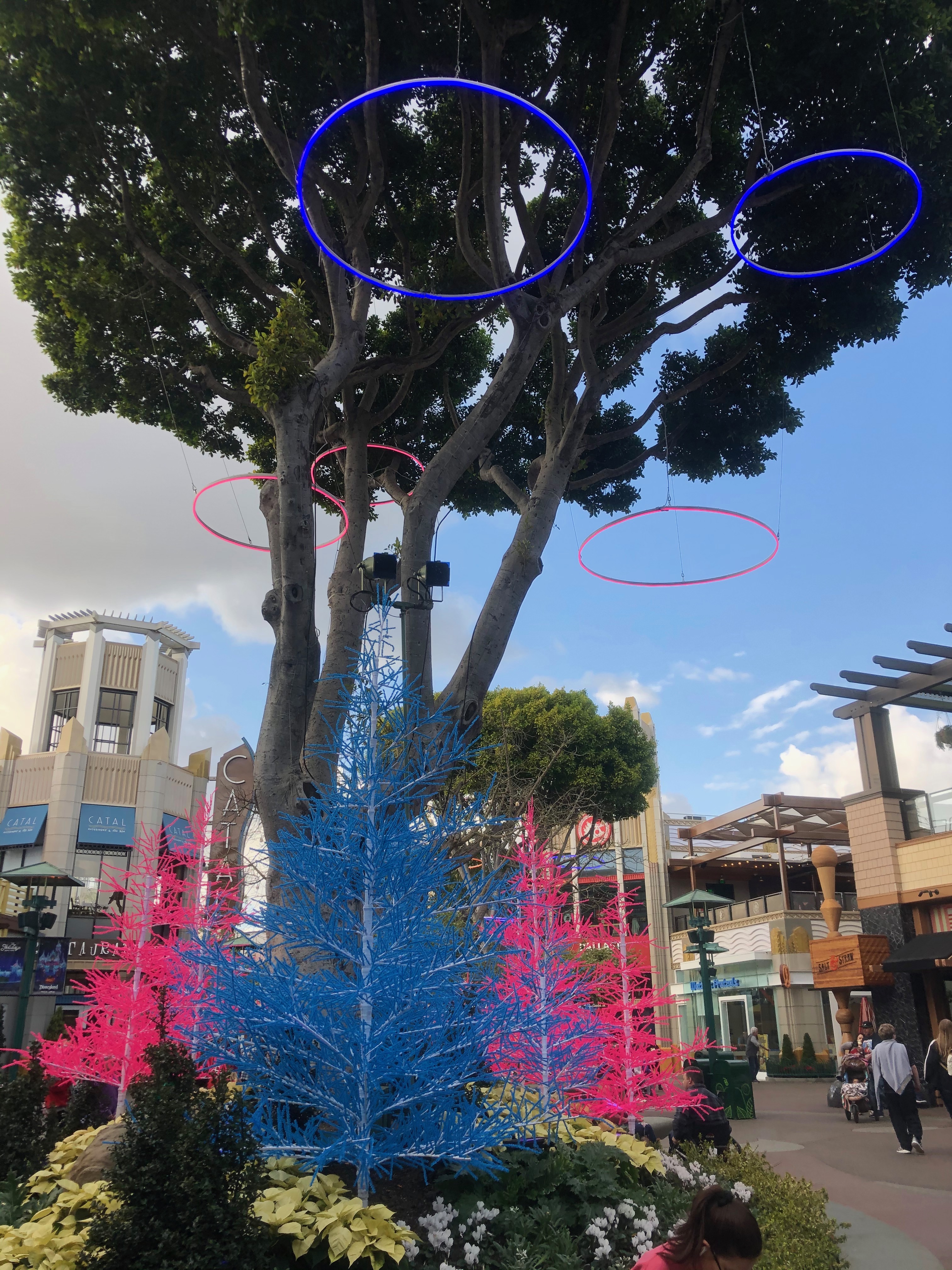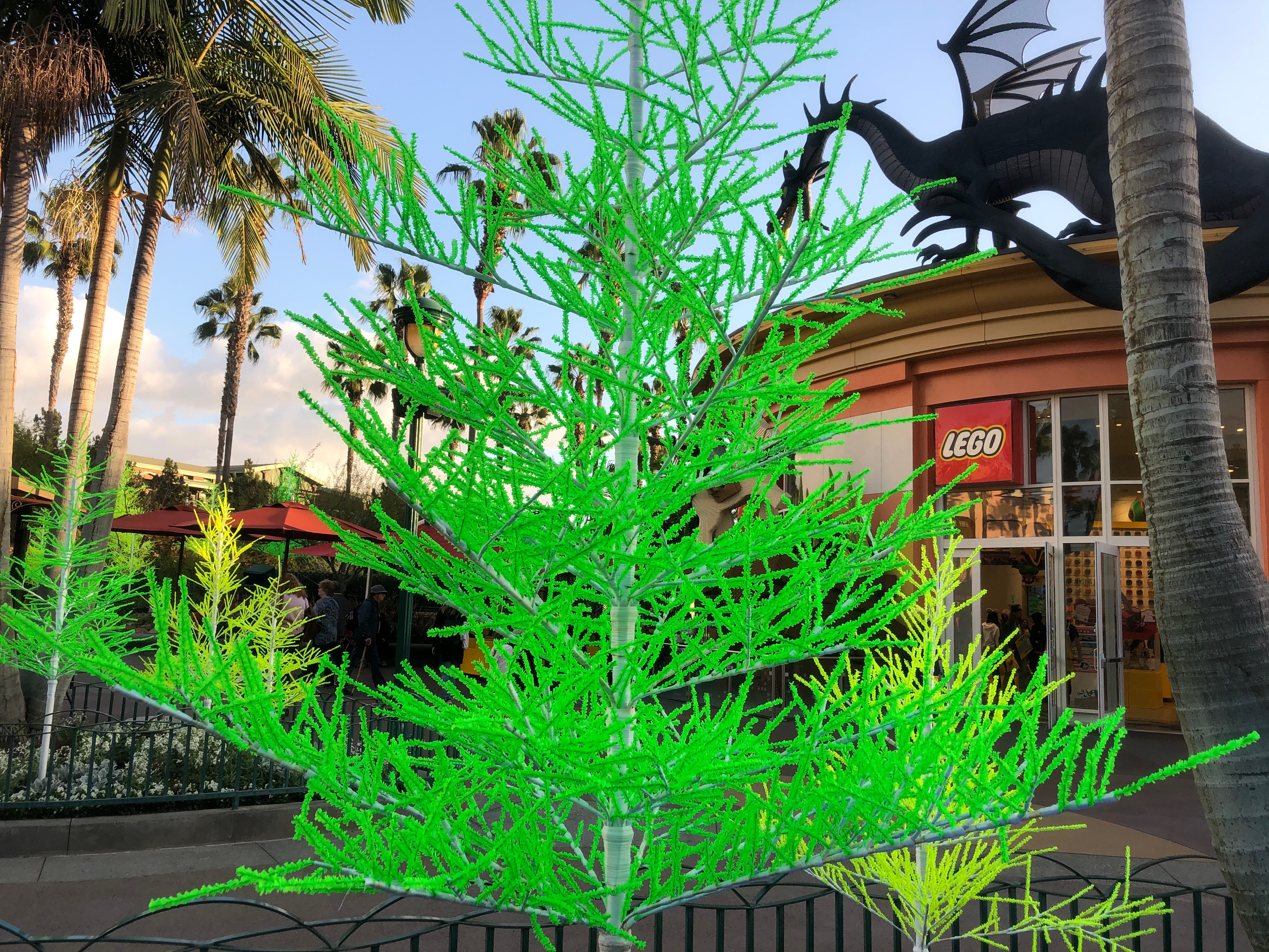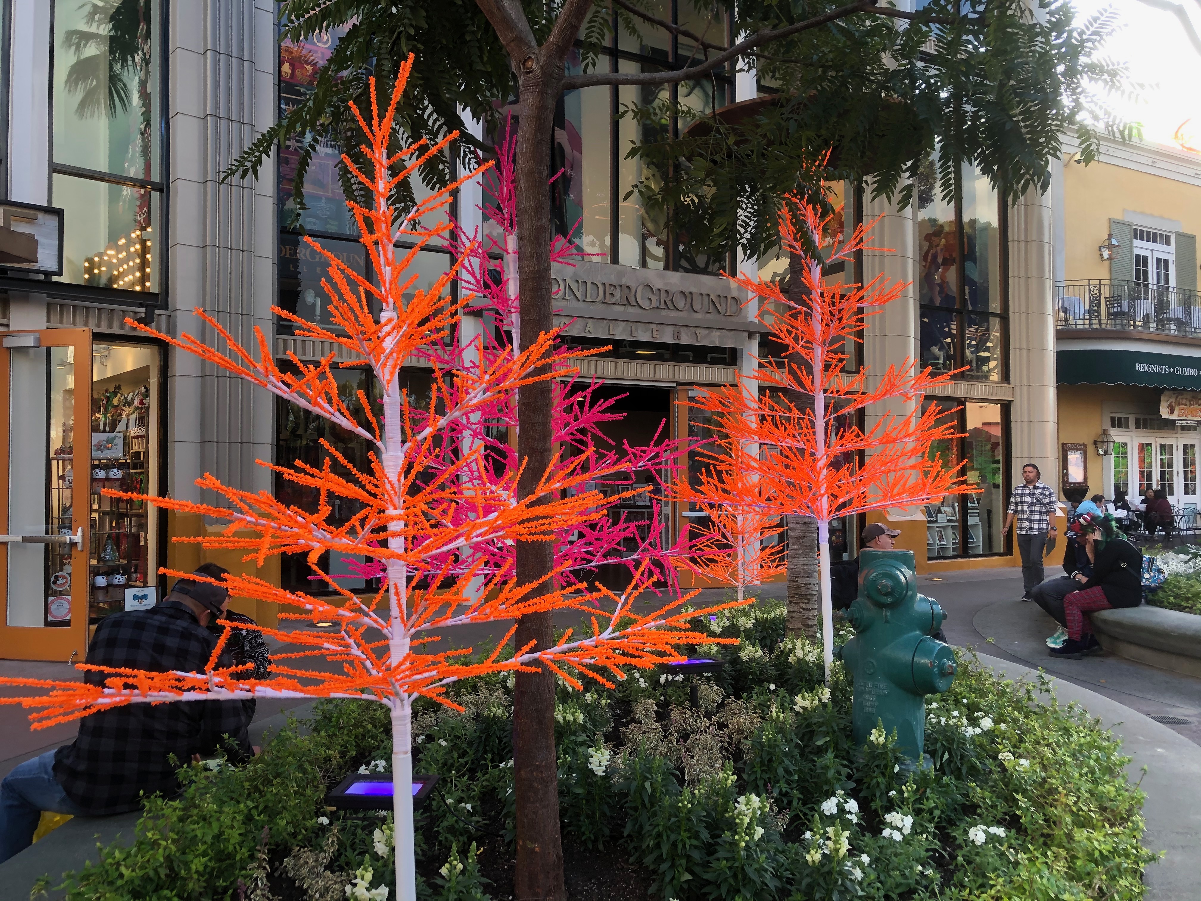 In addition to the trees there are over 70 glow tubes hanging from the ficus trees. As we get closer to the middle of Downtown Disney the colors change to blue and pink.