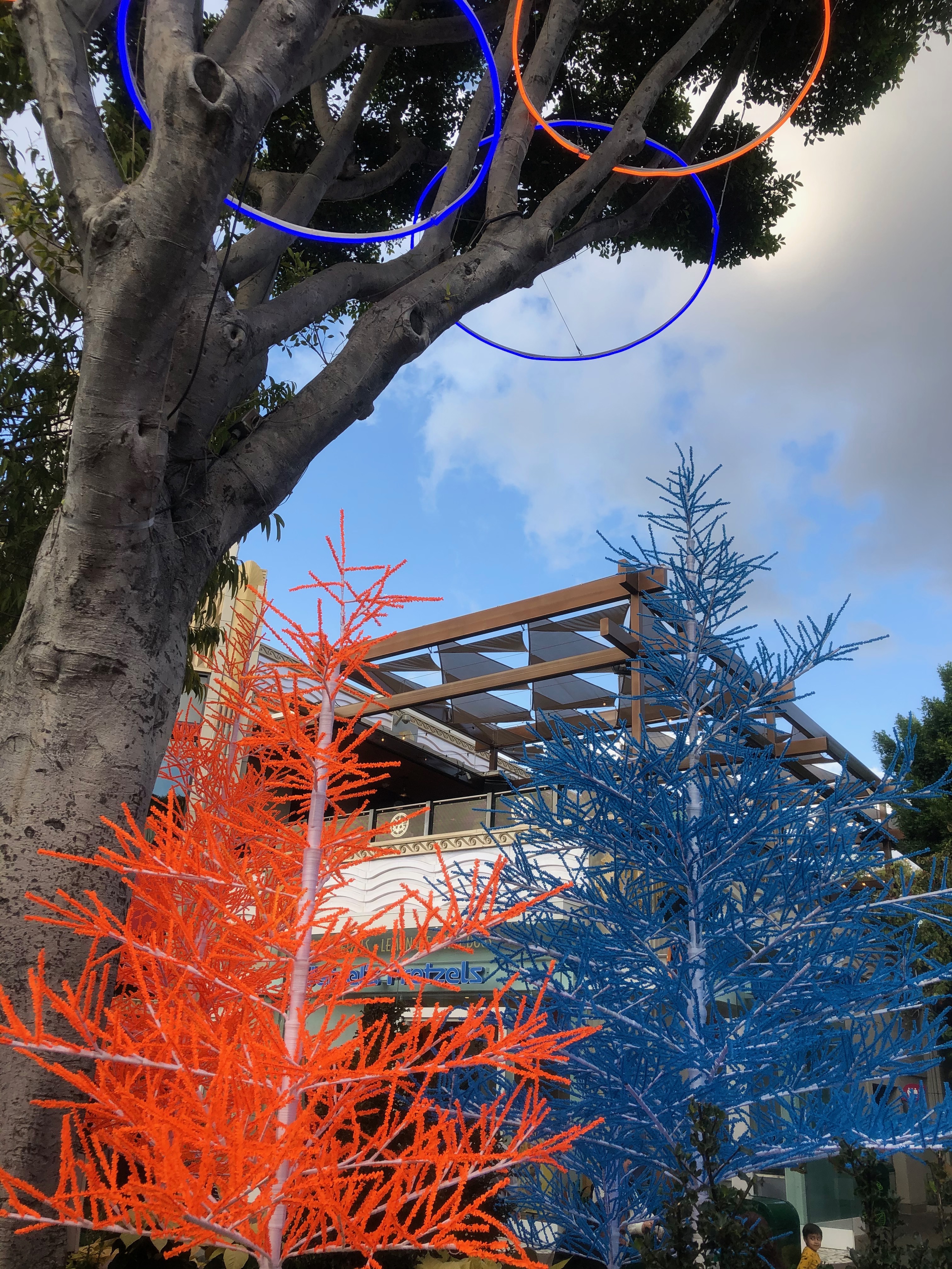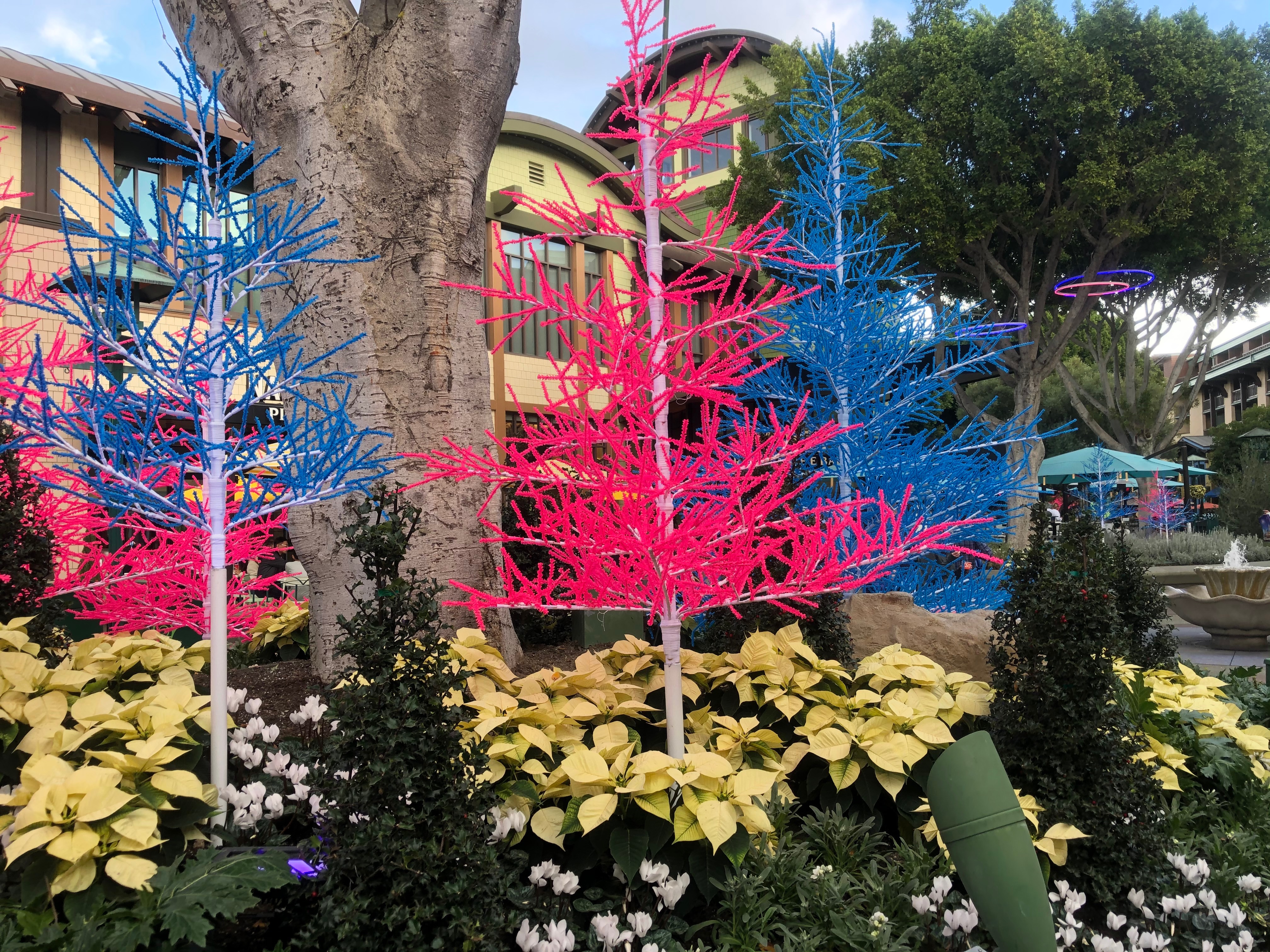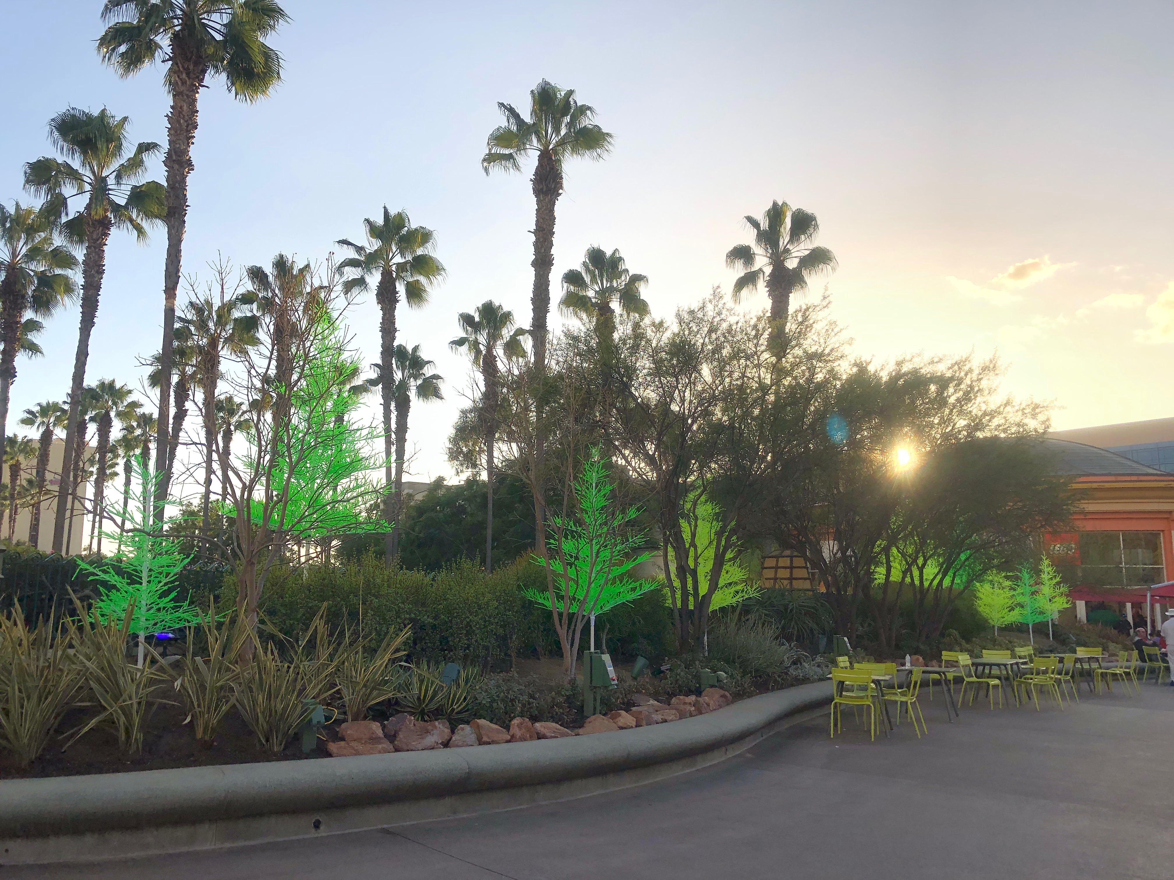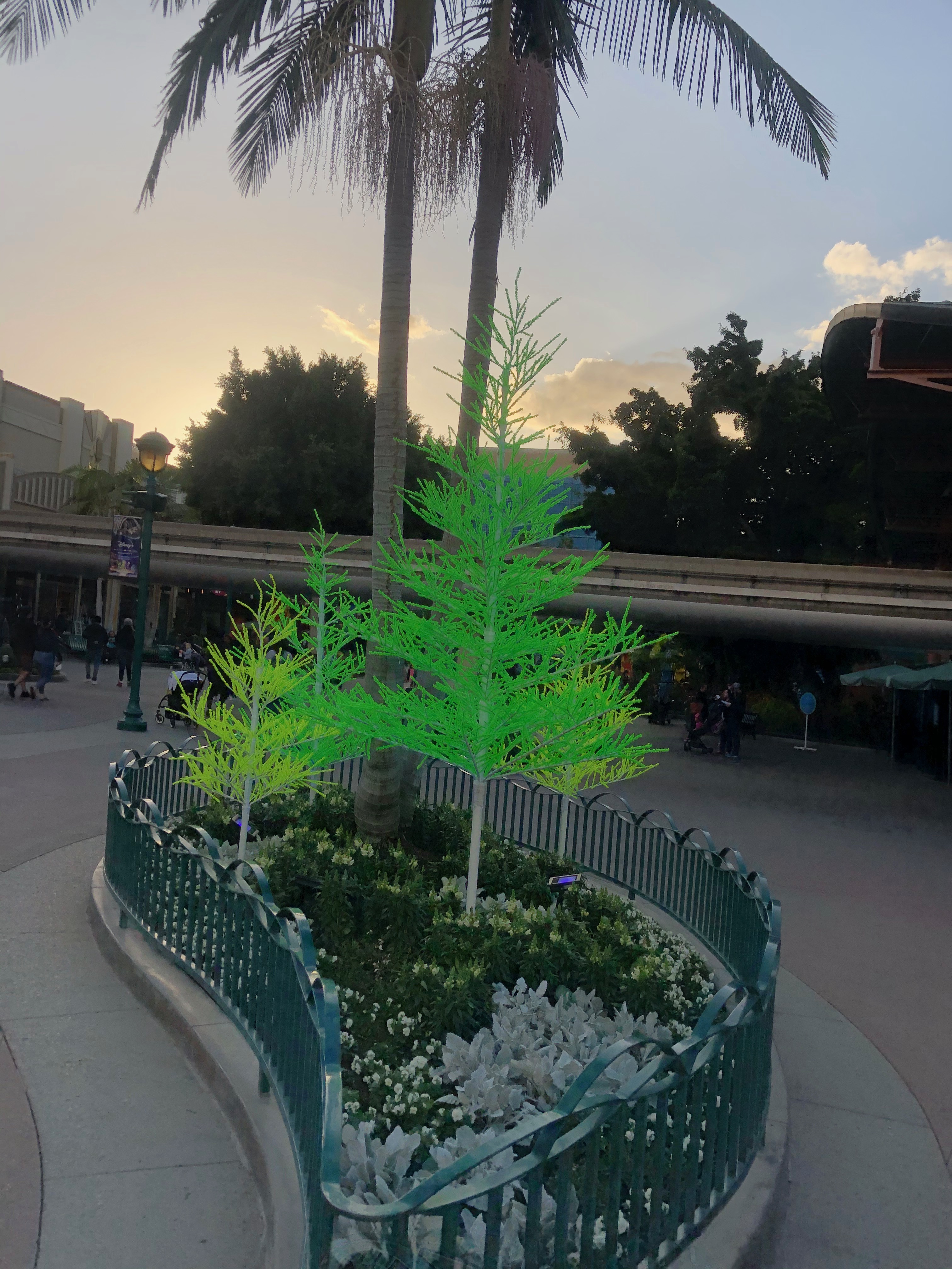 In addition to the trees there are over 70 glow tubes hanging from the ficus trees. As we get closer to the middle of Downtown Disney the colors change to blue and pink.