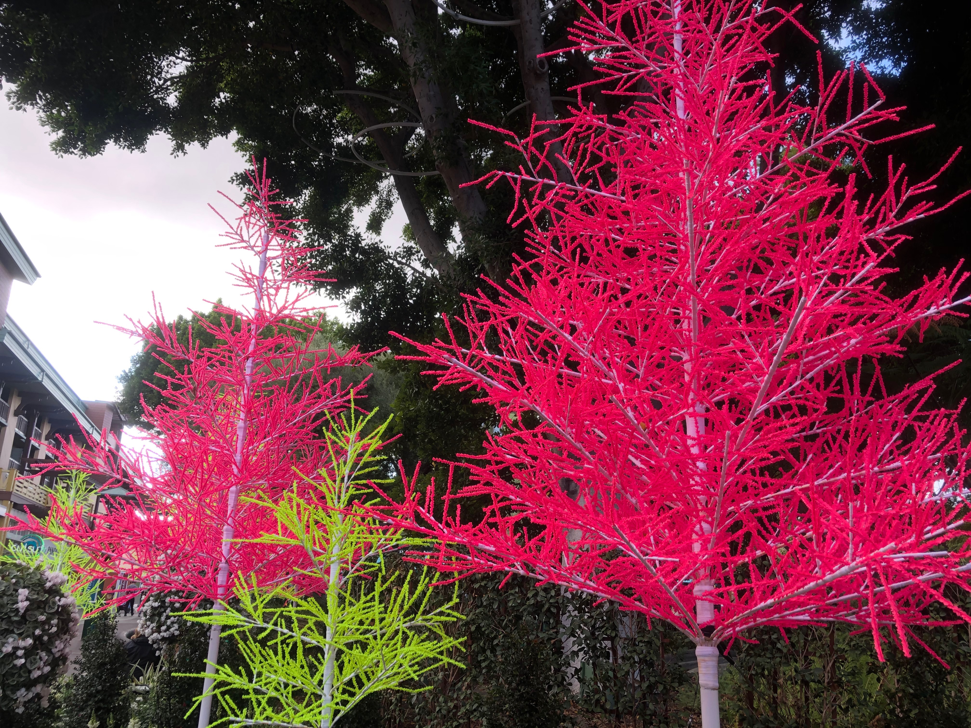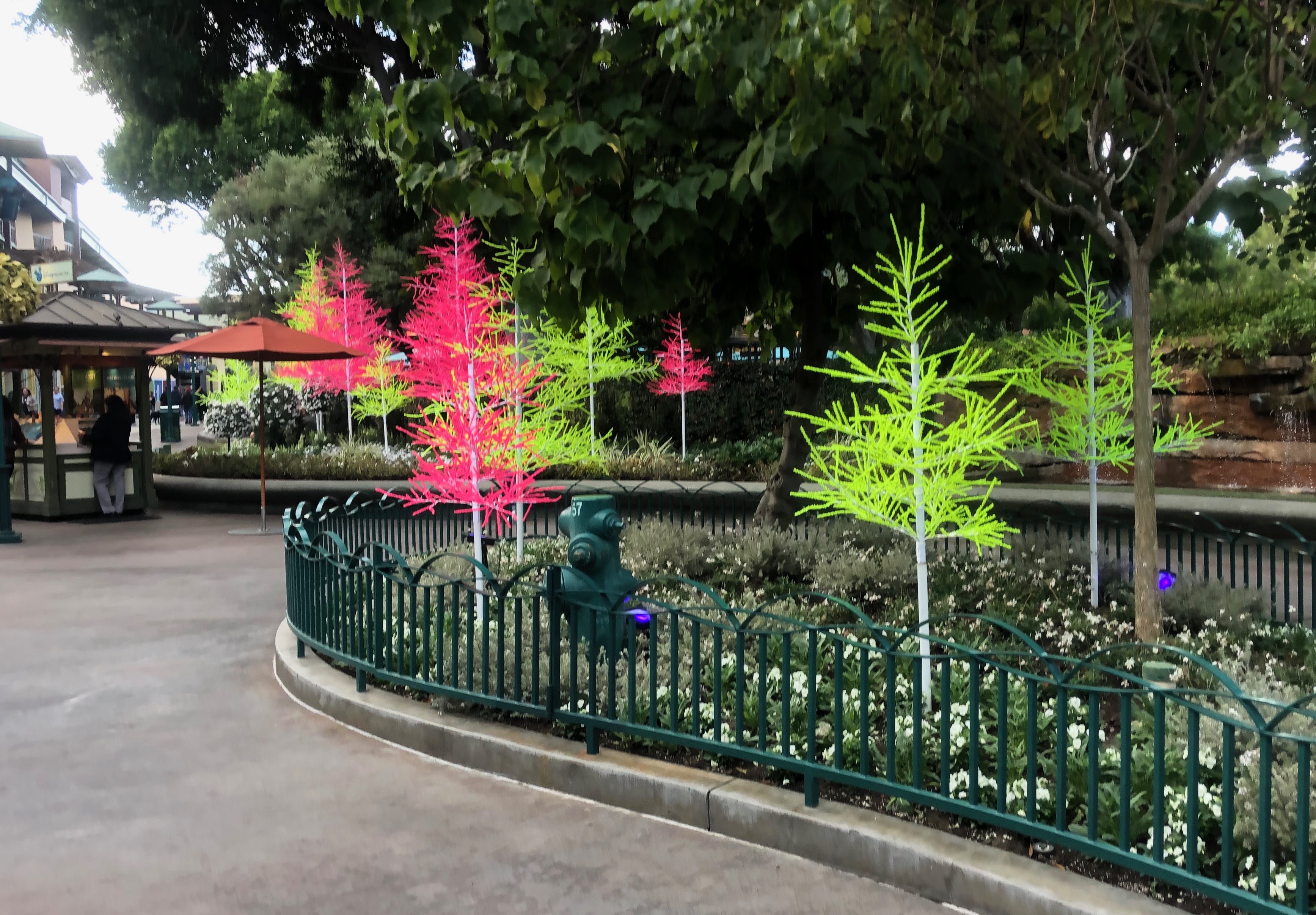 With over 200 UV Glow Trees we start with neon pink and green closest to the parks.