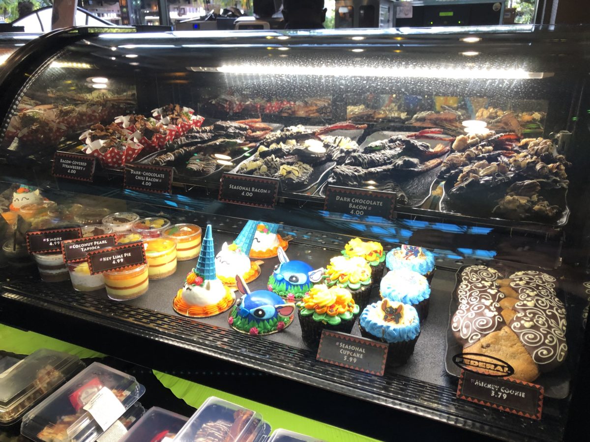 Chocolate covered strawberries and chocolate bacon join various cupcakes and desserts in the display. As before, the bacon strips retail for $4 and the specialty strawberries retail for the same price.