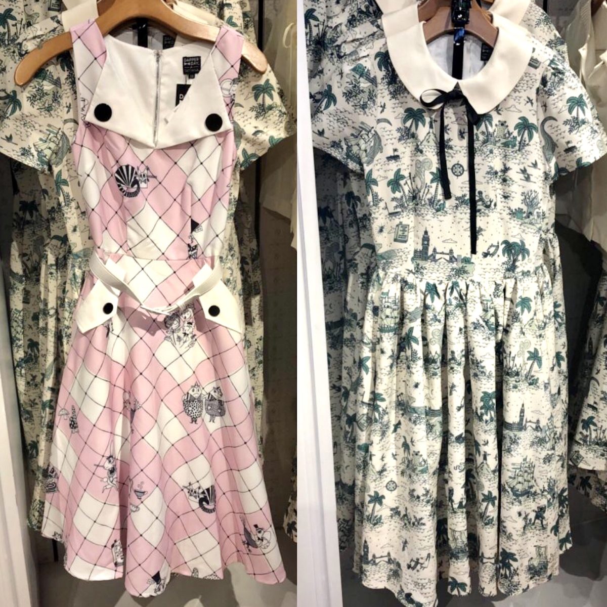 It’s the second star to the right and straight on ’til Dapper Day in these stunning dresses, both with an adorable, yet subtle, Neverland-inspired print. Both are fitted, with black detailing on the buttons (pinafore) and neck ribbon and separate belt (collared dress). Let’s take a closer look at that fabric…