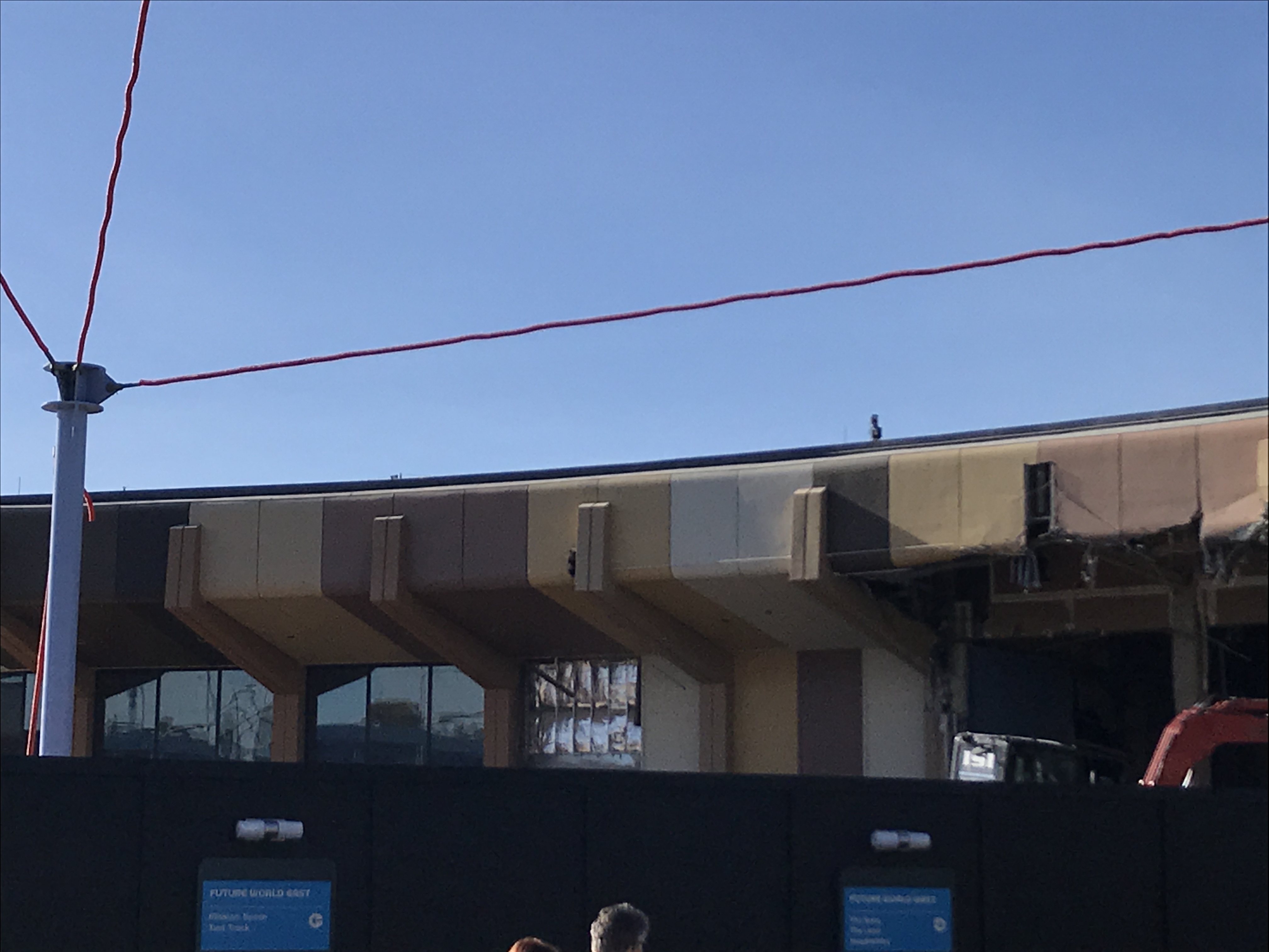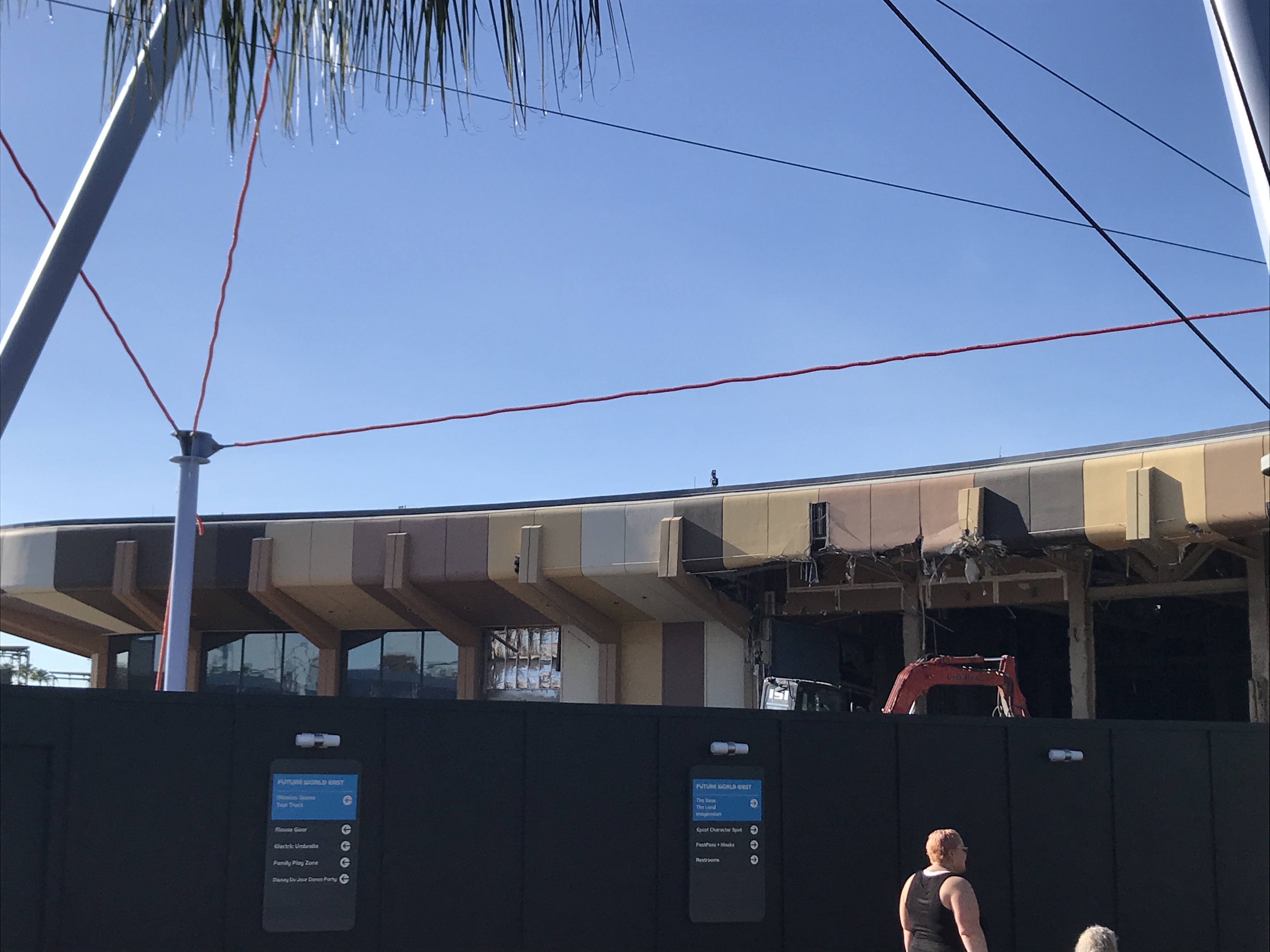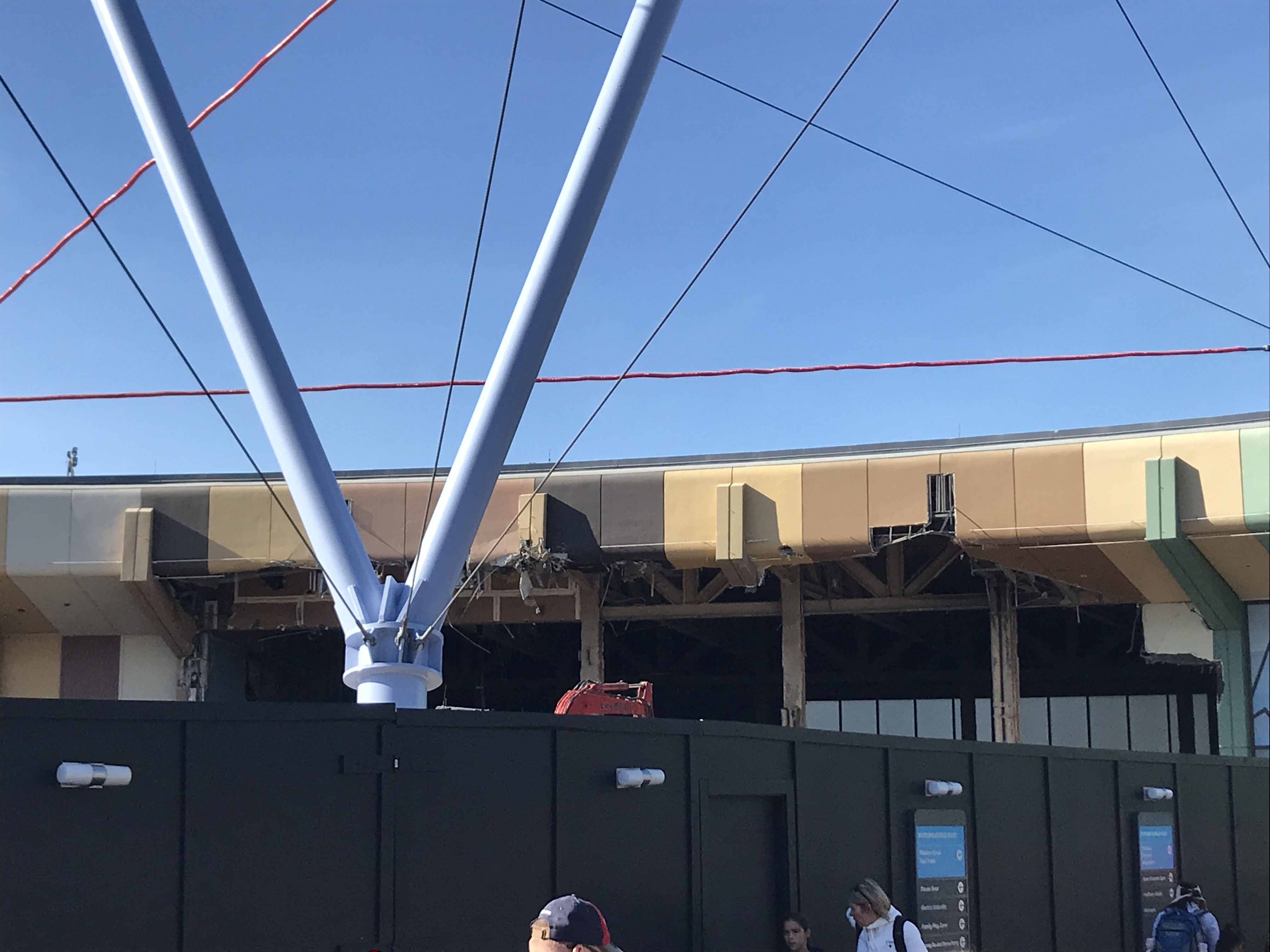 The most drastic change we noticed in our last update was the removal of Fountain View’s signature circular roofing section. Without it, the structure seems bare and the overall demolition process is more noticeable. While we were in the park, we heard numerous guests remarking about the state of the building. Now, it seems like demolition is making its way into the interior of the former CommuniCore/Innoventions West structure.