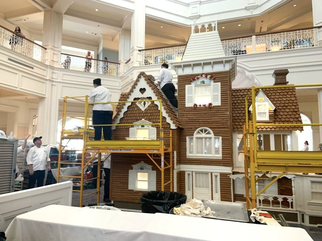 Over at Disney’s Grand Floridian Resort and Spa, delicious construction is underway on the annual Gingerbread House. Earlier this week, the main structure for the house went up and now it is almost entirely covered in tasty cookie shingles.