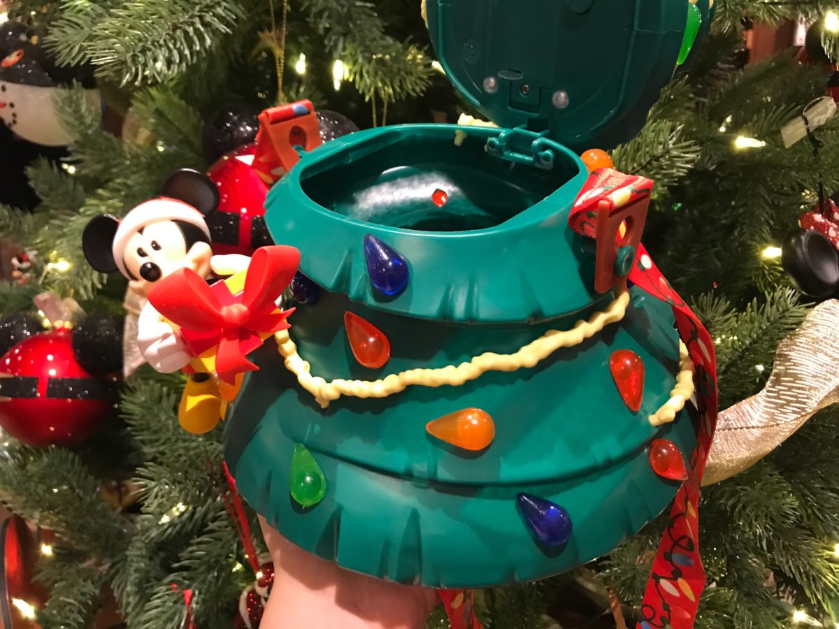 The bucket features Mickey decking out his tree with presents, lights, and a delicious-looking popcorn garland.