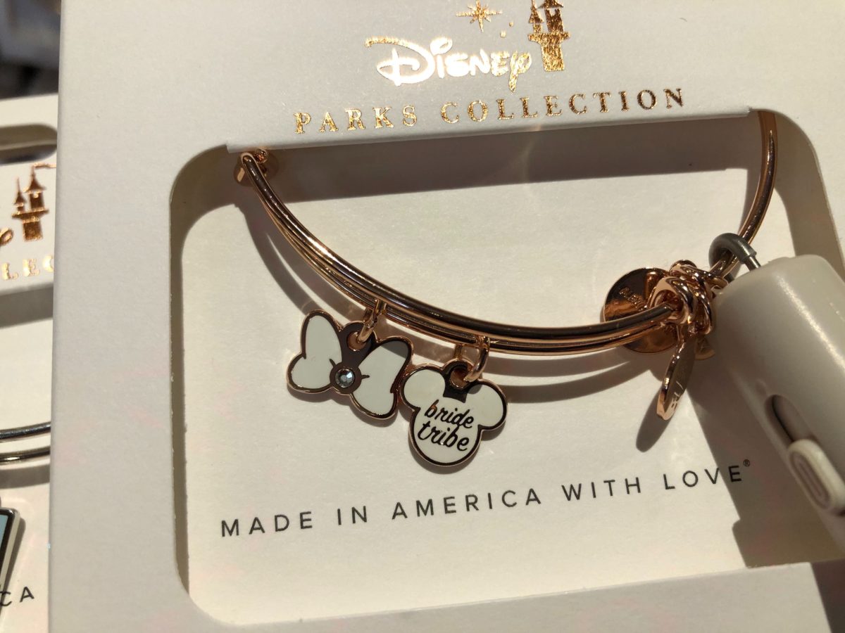I’m not nearly as crazy about this bracelet, which features the words “Bride Tribe” on a cream-colored enamel Mickey head charm. A second Minnie mouse bow in matching cream enamel and a gem in the middle makes a pair of charms.