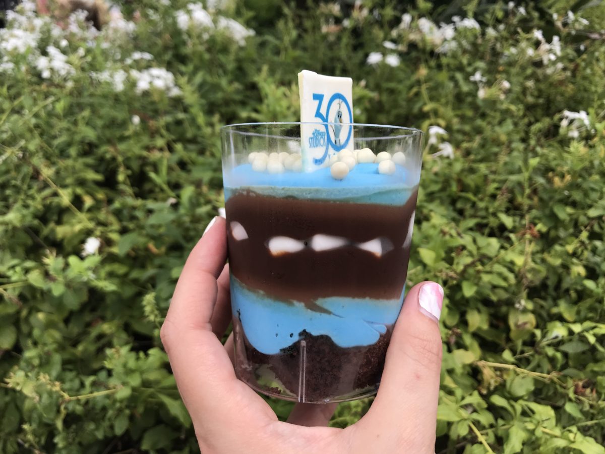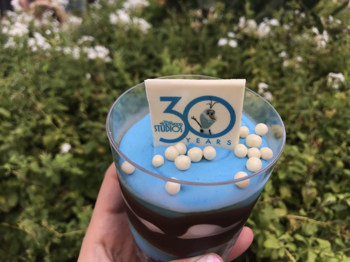 The dessert is topped with a white chocolate Olaf waving from inside a Hollywood Studios’ 30th anniversary logo. Milk chocolate crispy pearls are also sprinkled on top.