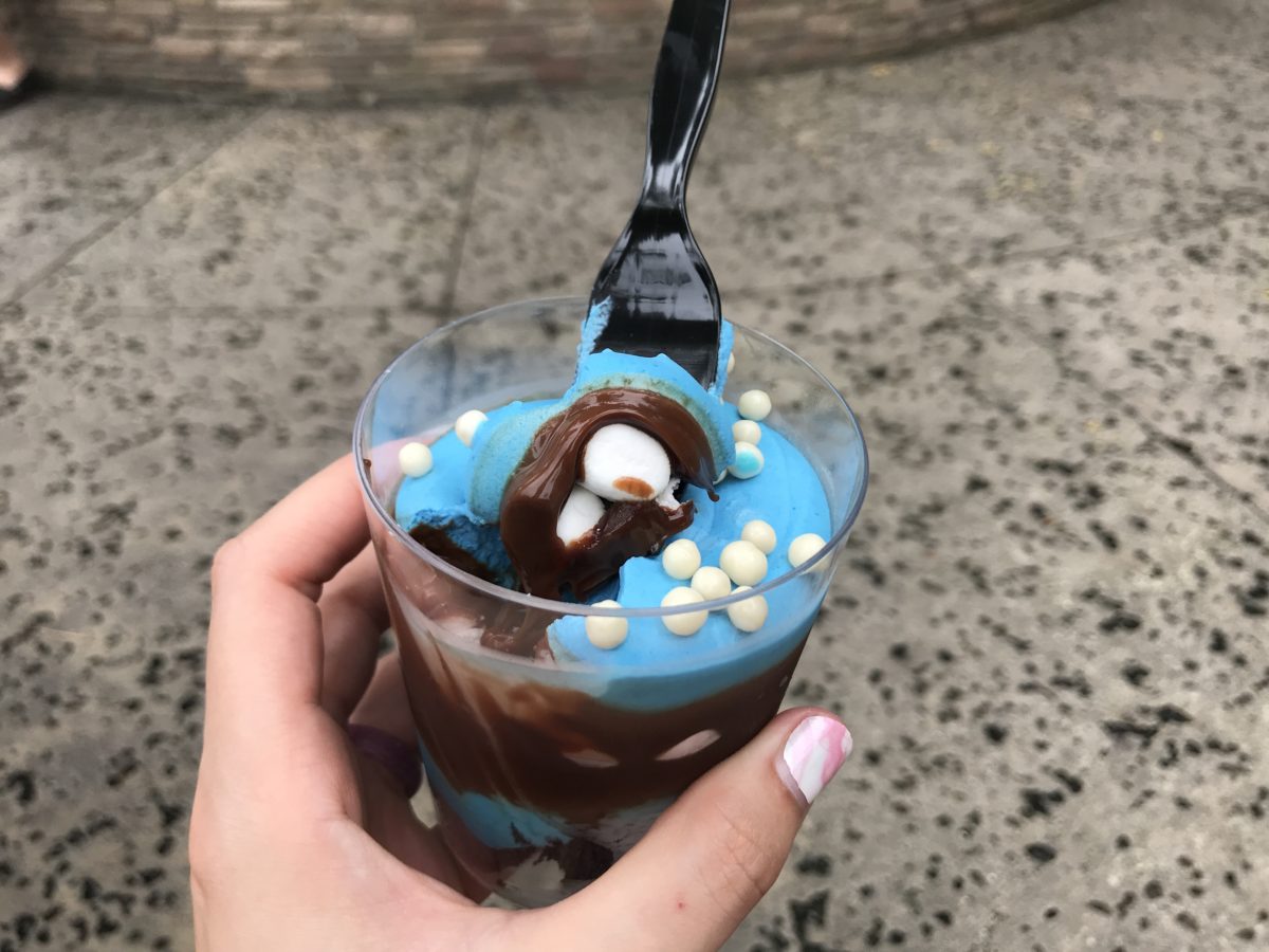 We were wary that this dessert might have too much marshmallow, but we were pleased to find the blue layers were whipped cream rather than marshmallow fluff. We found this dessert to be right up the alley of chocolate lovers. It’s milk chocolate on top of milk chocolate, but we’re not mad about it. The blue coloring is just food dye and doesn’t affect the taste. It also has a thicker consistency that the rest of the verrines around the park.