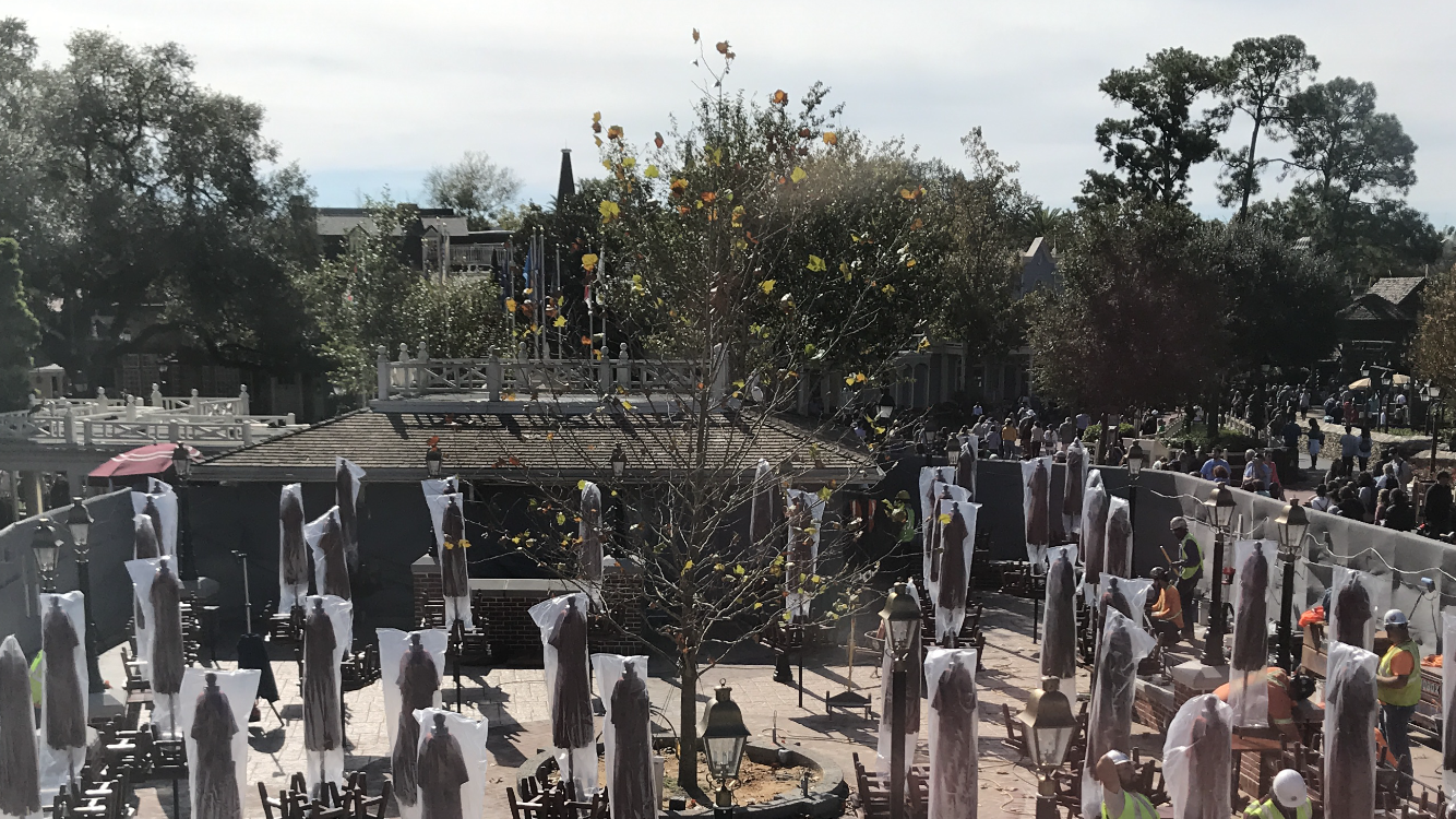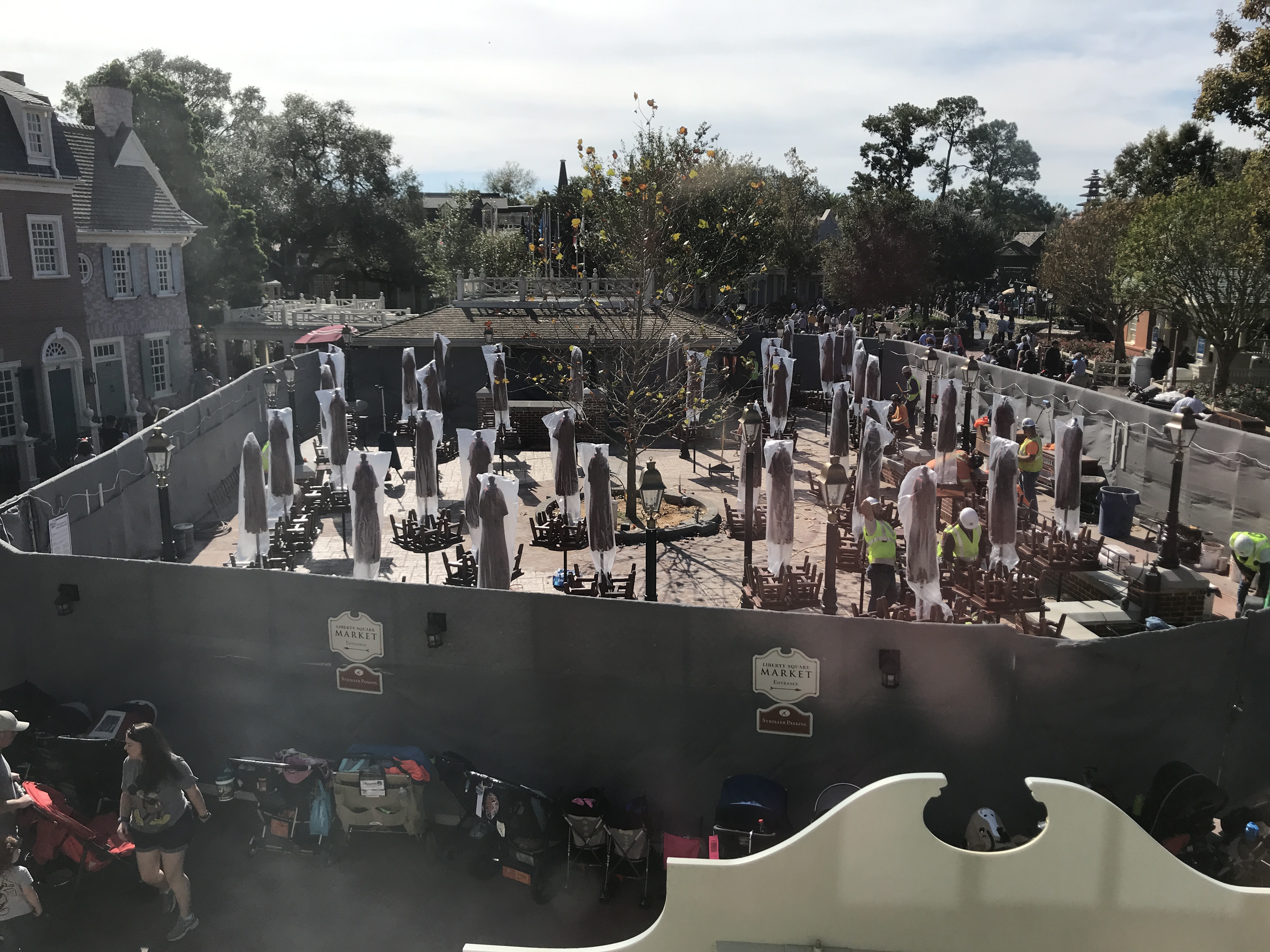 Hold on to your mop hats and powdered wigs, because the colonial construction project in Liberty Square appears to be preparing to open. As we noted from the last time we stopped by Magic Kingdom, the cobblestones had been laid and workers were starting to clean up around the site. We now know why they were tidying up! The dining area’s umbrellas, tables, and chairs have arrived!