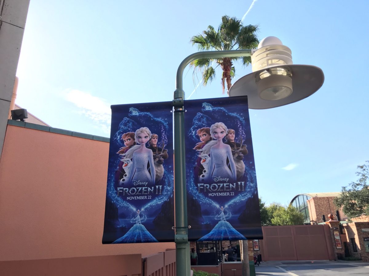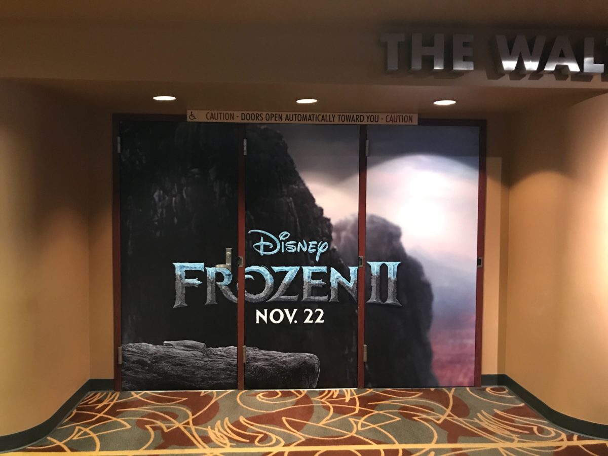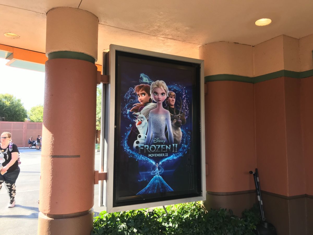Frozen 2 premieres on November 22, but Walt Disney Presents is already decked out in banners and posters. The movie is advertised on the entrance marquee as well.