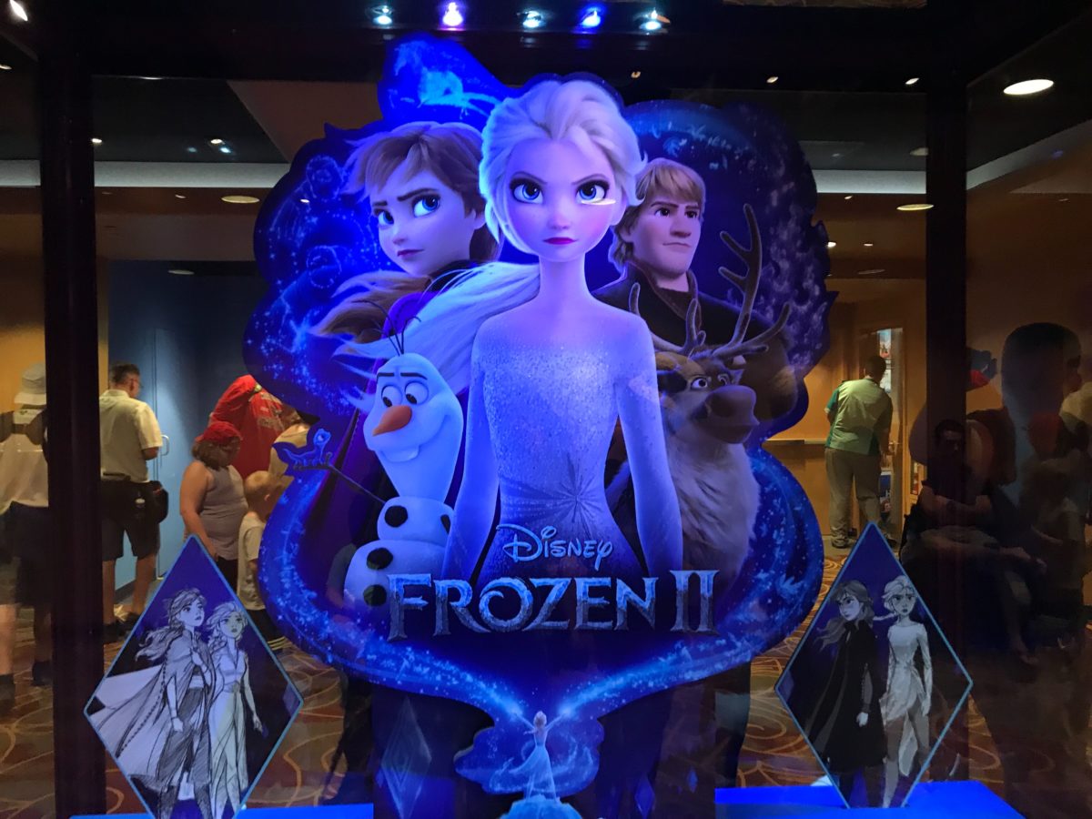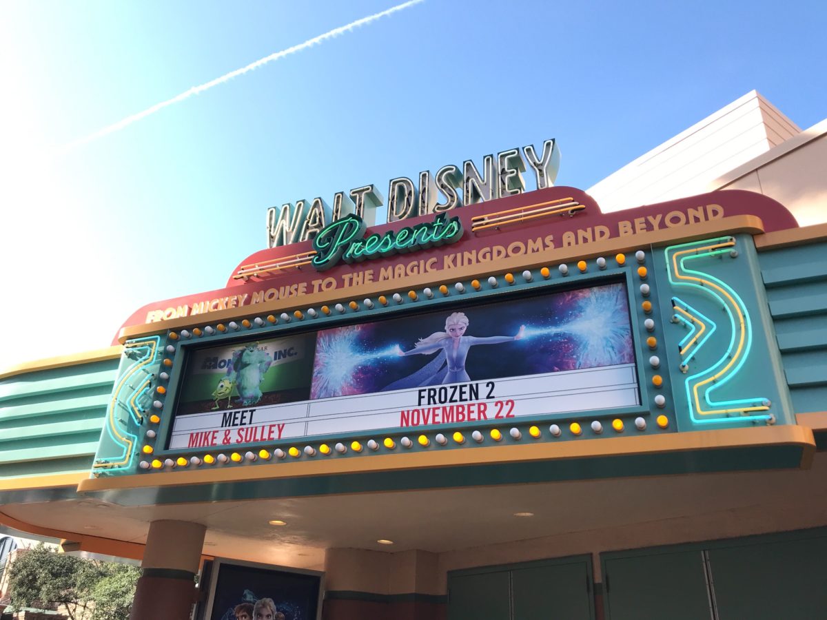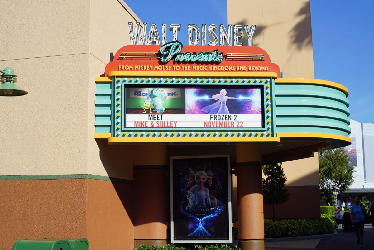 Frozen 2 premieres on November 22, but Walt Disney Presents is already decked out in banners and posters. The movie is advertised on the entrance marquee as well.