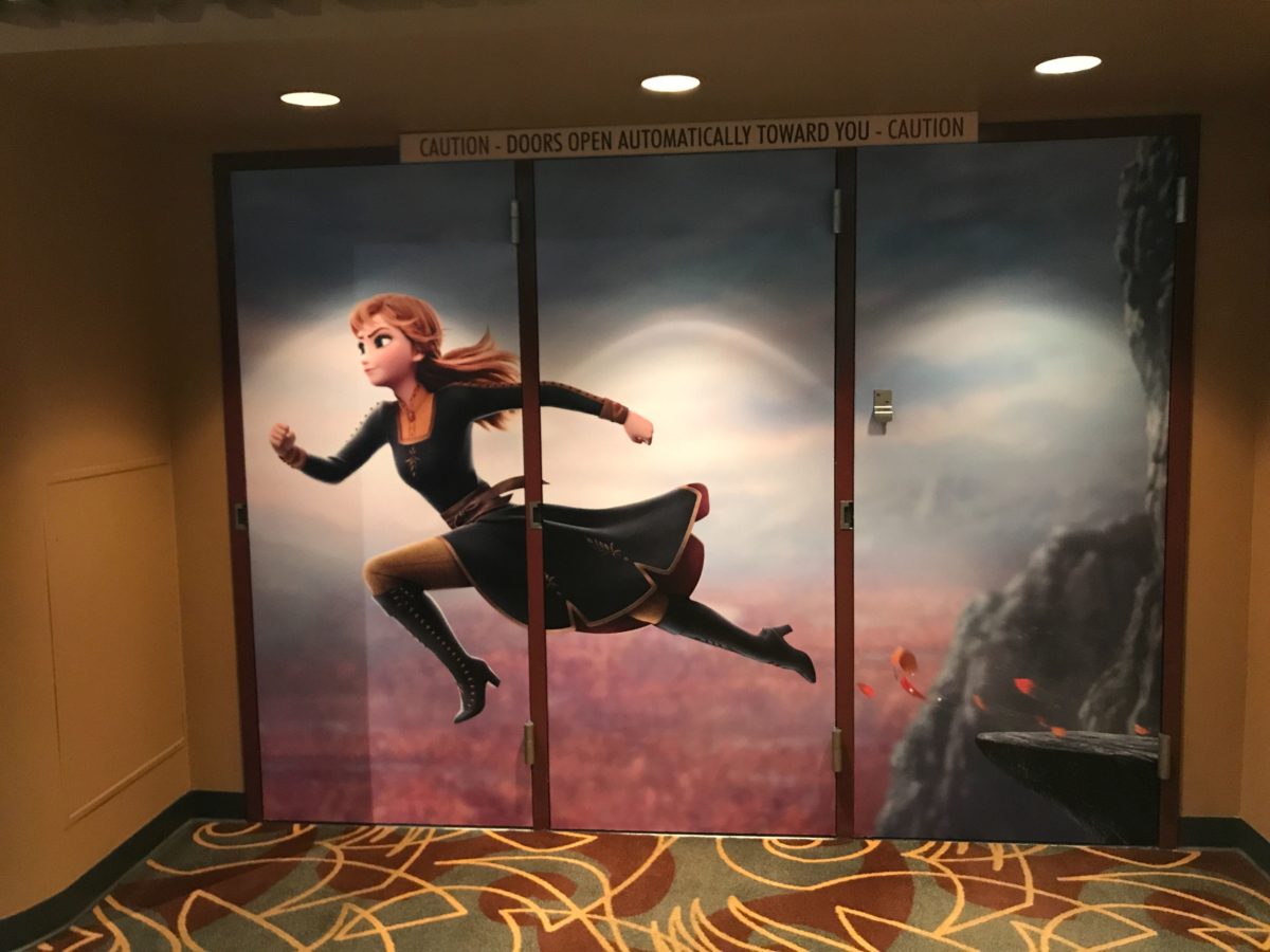The doors to the theaters have also received these neat wraps, featuring the movie logo and Anna taking a leap of faith: