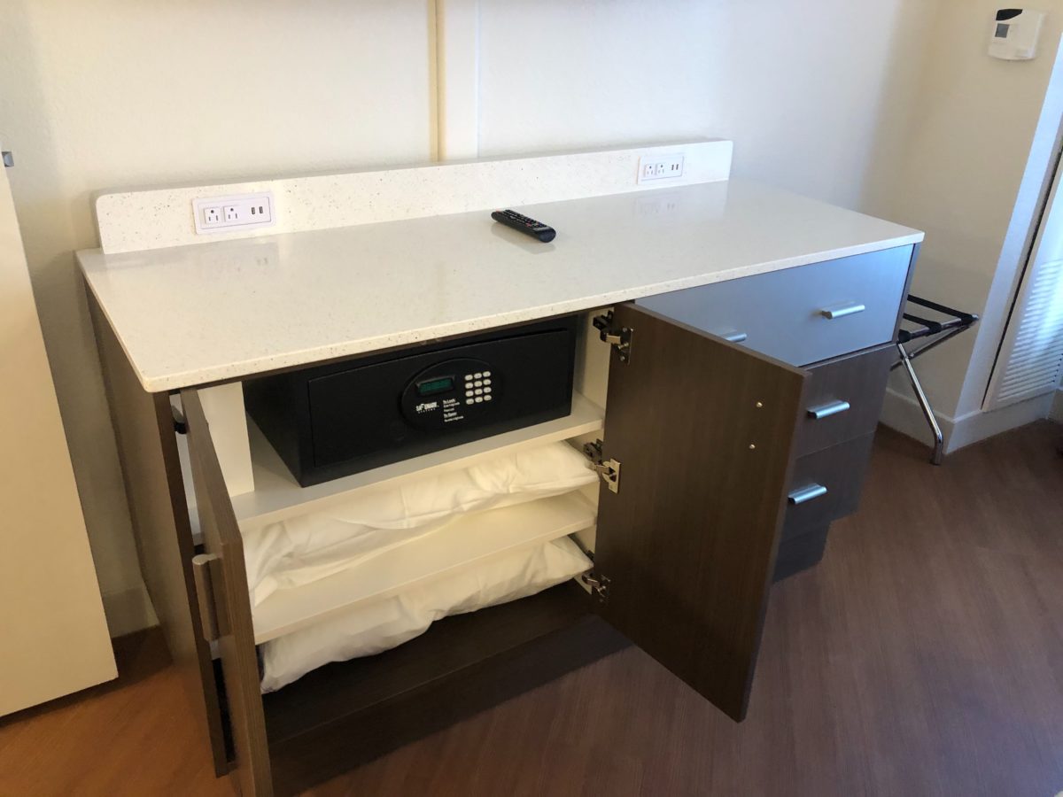 In the dresser under the TV, you’ll find a safe and extra pillows.