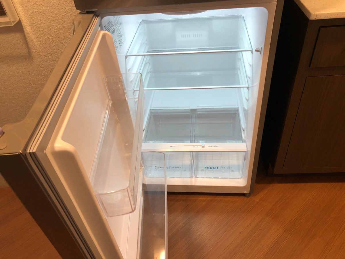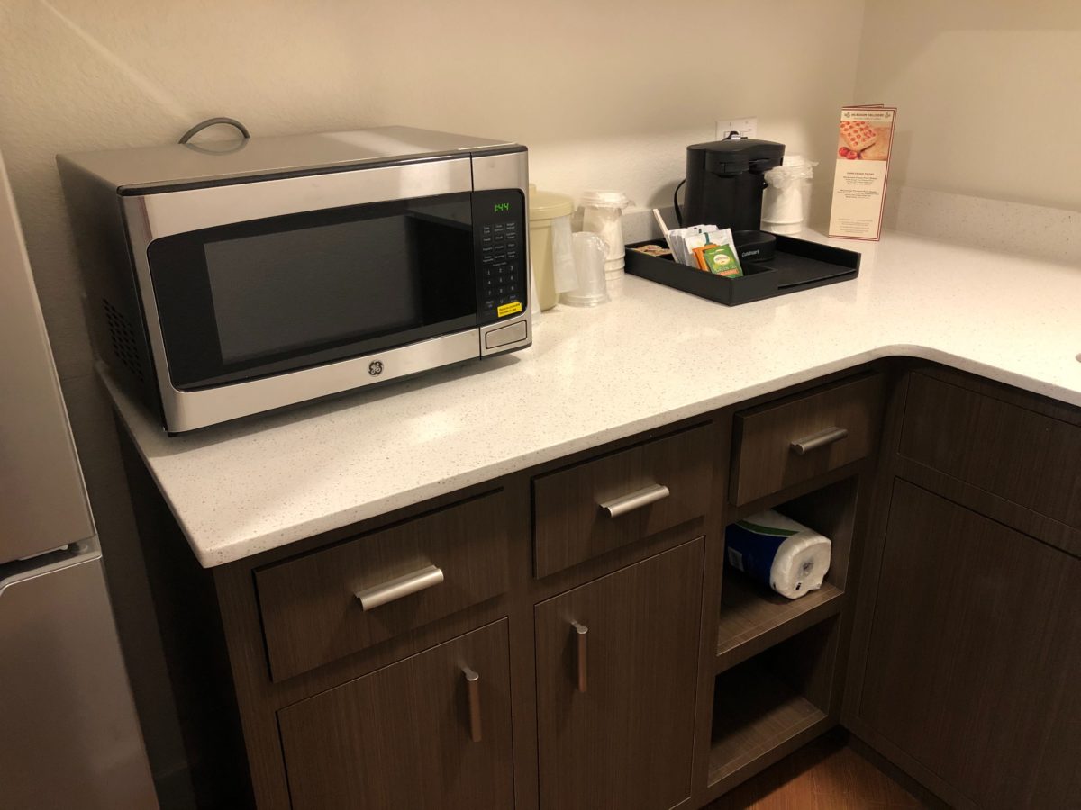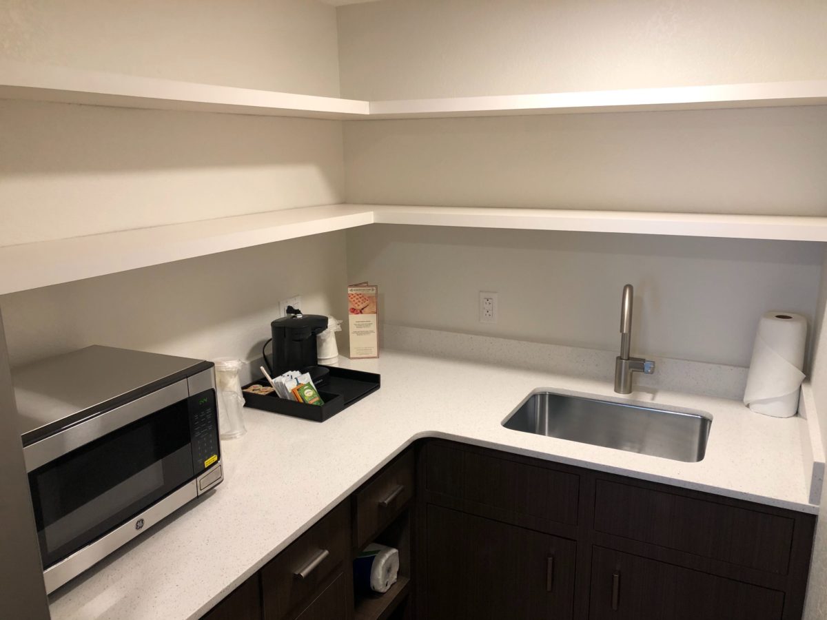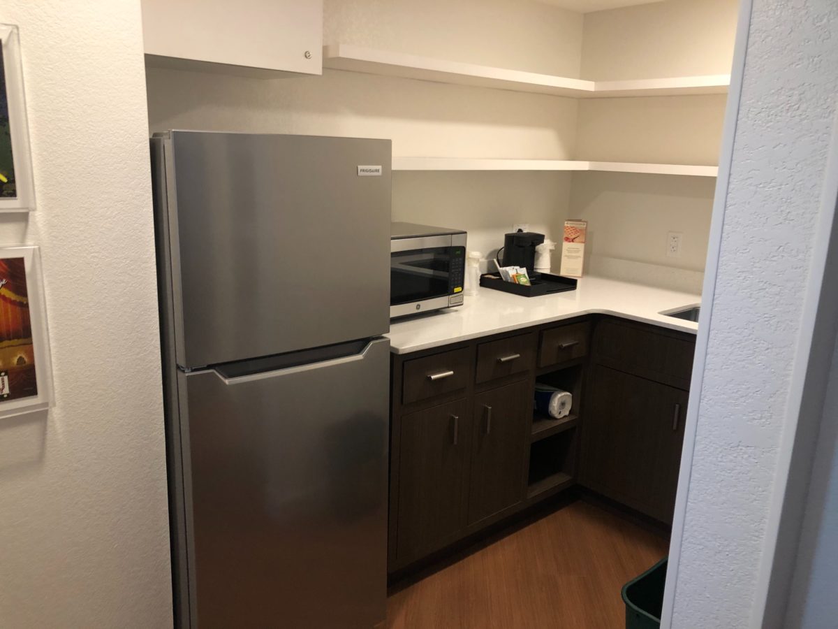 The kitchenette area features a microwave, sink, and a refrigerator. There is even a freezer section.