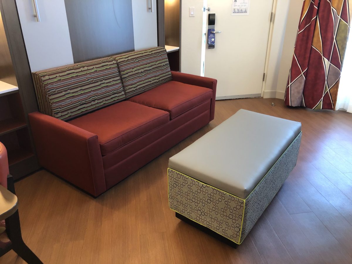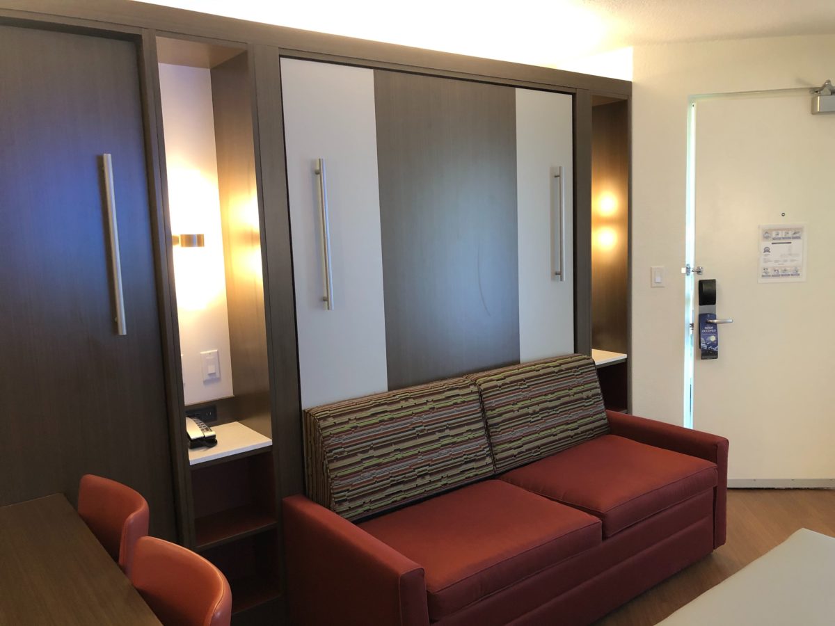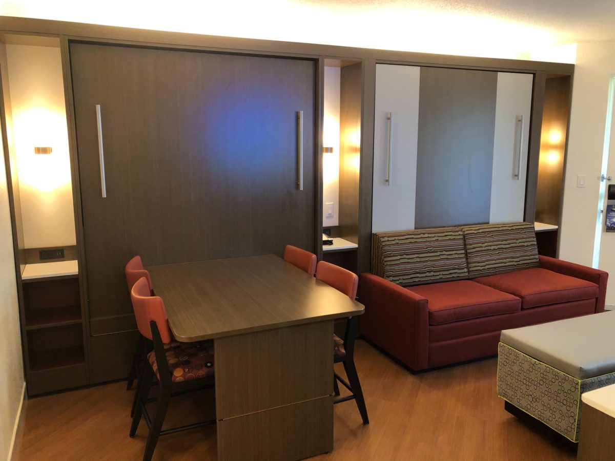 Upon entering the room, you’ll find a table and chairs, couch and ottoman, and a dresser and tv. Two queen sized beds can be pulled down from the walls with ease, allowing this room to fit many more people than a standard room.