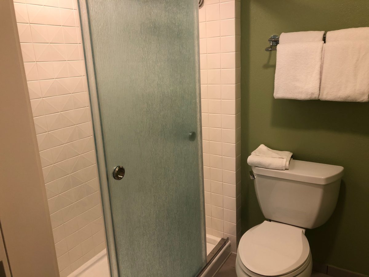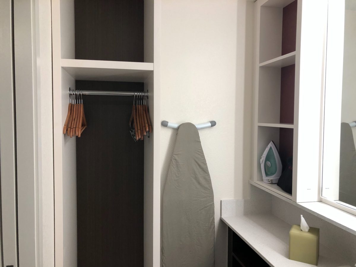 This bathroom has a shower, but no bath tub. There’s a dual shower head and a shave ledge. There’s also plenty of storage space, a hair dryer, and a iron and ironing board.
