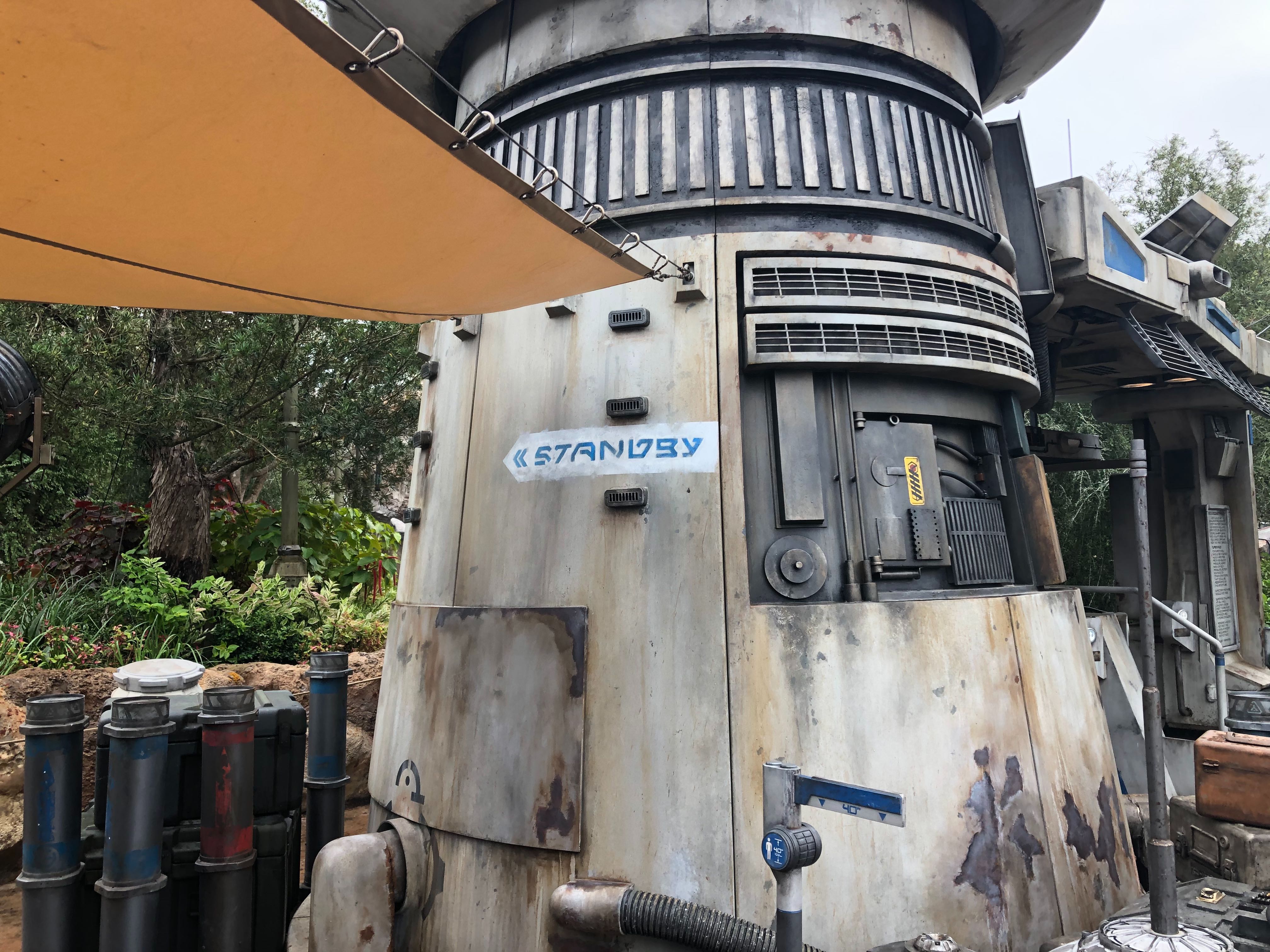 As is customary, numerous warning signs are posted. The FastPass+ touch points, which are the same ones that were installed at the Disneyland location of Star Wars: Galaxy’s Edge, used to have a cavity in the bottom for the MaxPass system where guests scan their phones or tickets. That has been covered up by a weathered metal plate on each touch point. Do keep in mind that FastPass+ will not be available for the attraction during its first weeks (or potentially months) after opening. It was also recently confirmed that the attraction would not be included as part of Extra Magic Hours offerings.