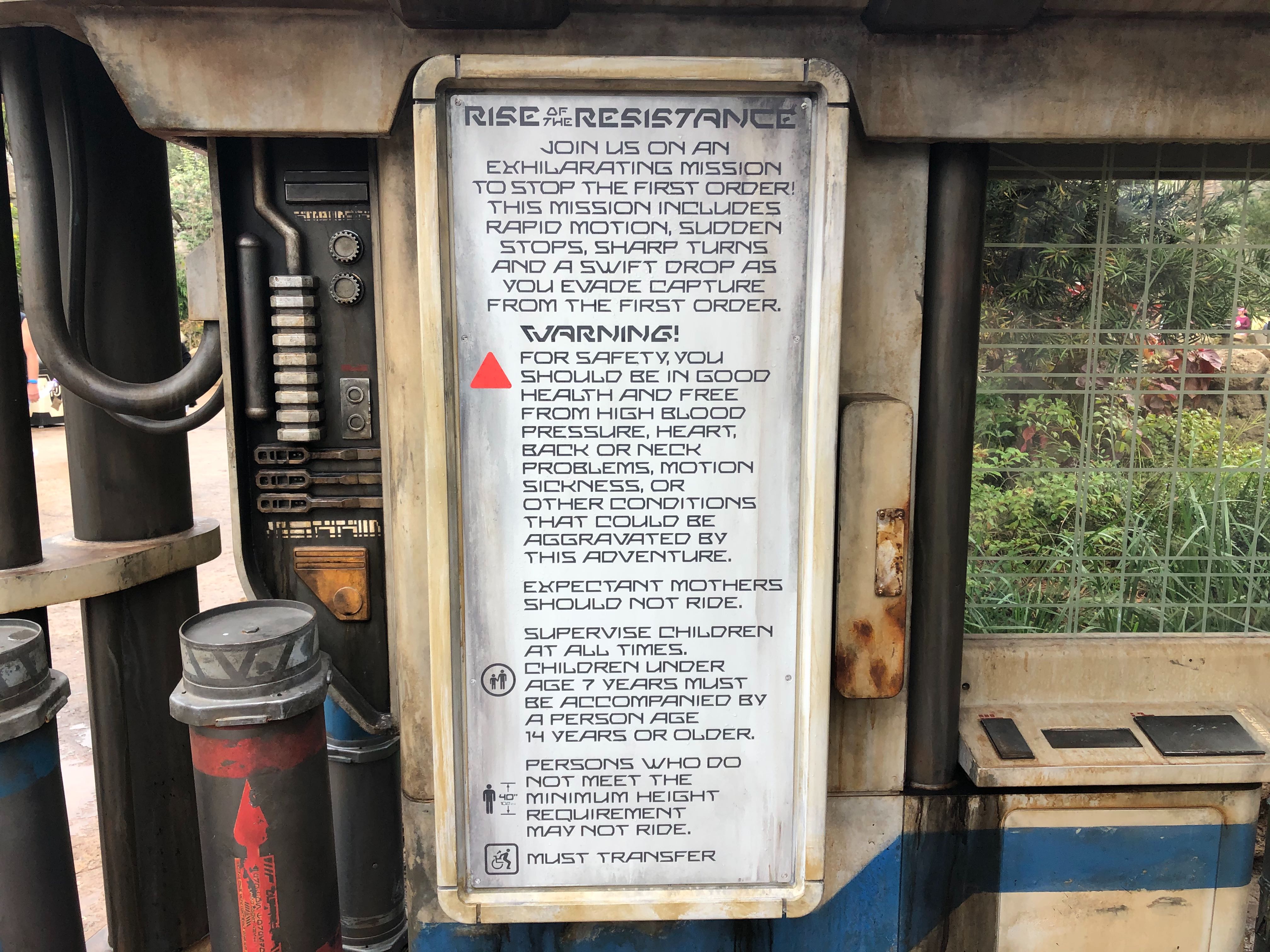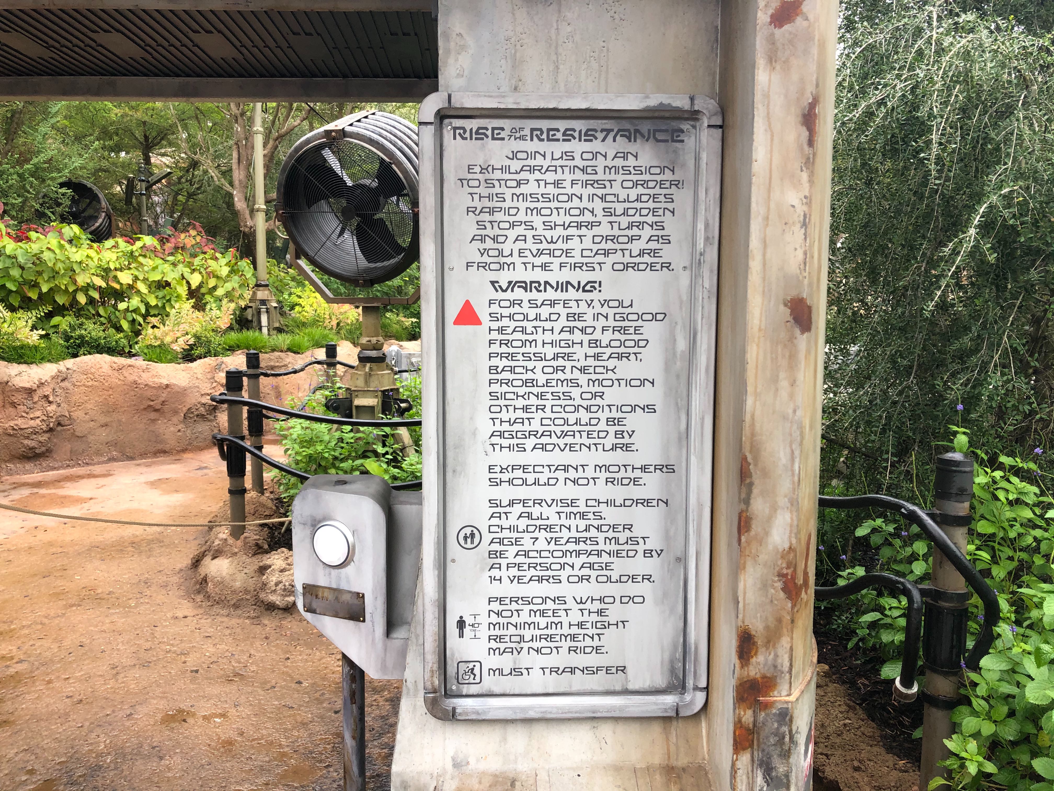 The sign goes on to indicate the minimum height requirement for Rise of the Resistance: 40 inches. For the record, other trackless Disney attractions such as Mystic Manor and Ratatouille do not have this restriction as they do not feature such drops. Children under the age of 7 must be accompanied by a person age 14 or older. Guests in wheelchairs or other mobility aids must transfer to the ride vehicle.