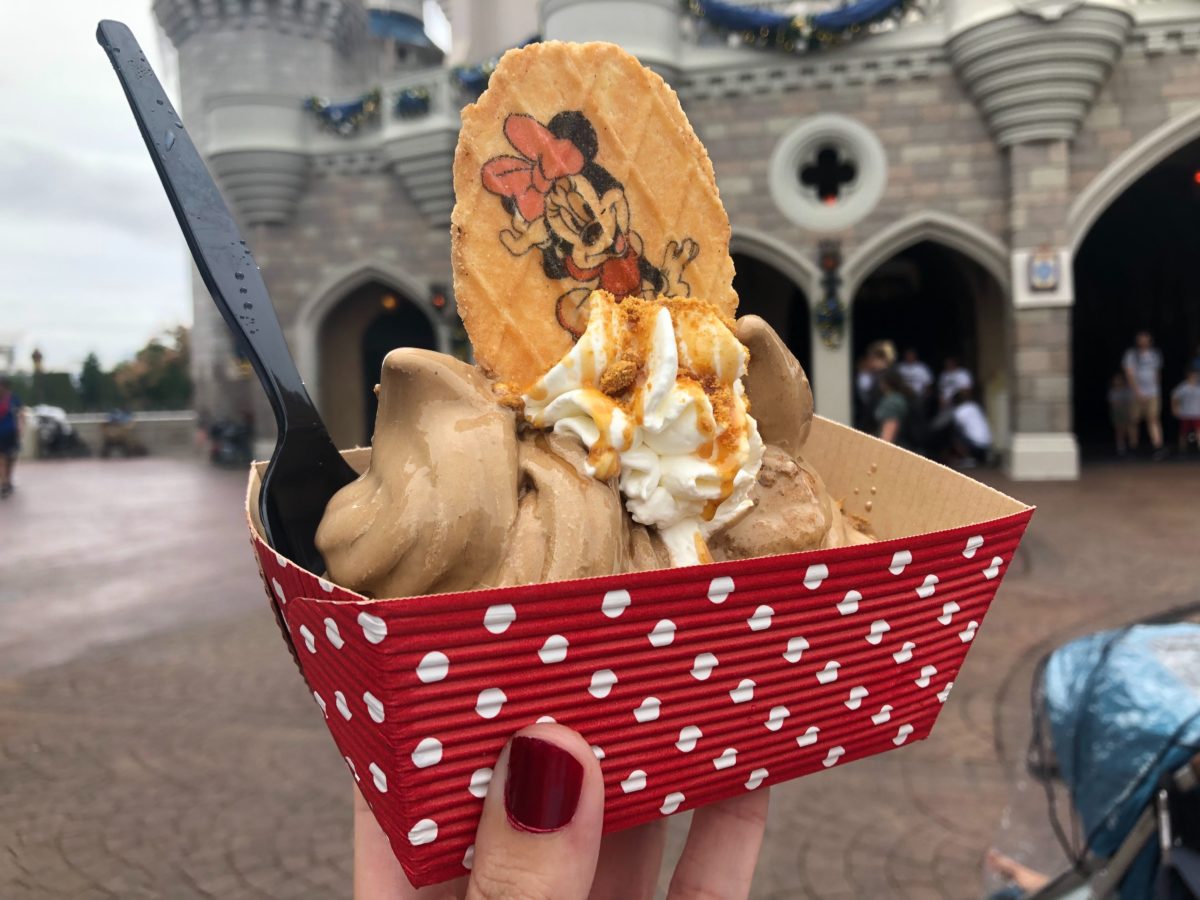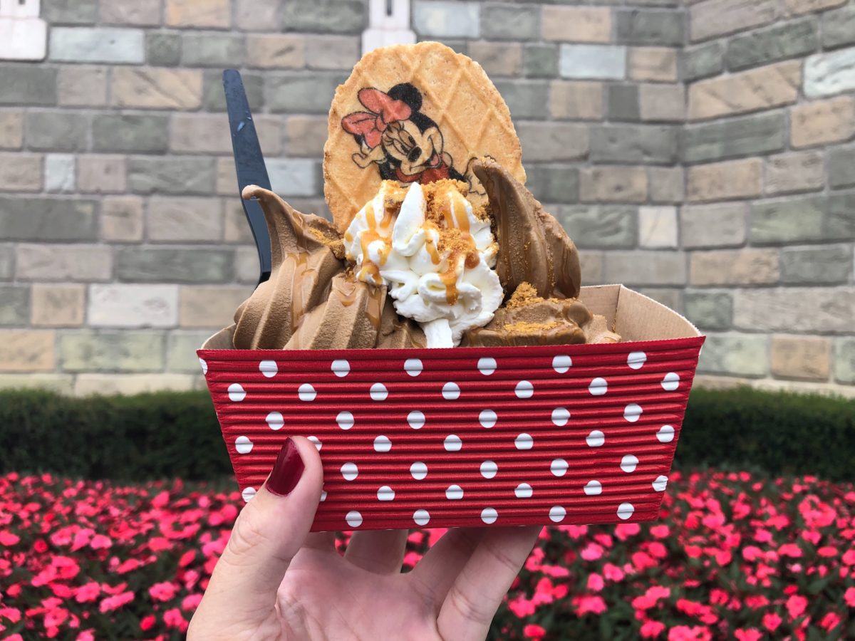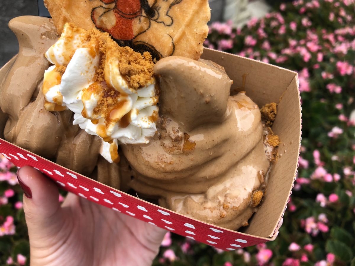 This Gingerbread Sundae, available for $6.49 at Storybook Treats in the Magic Kingdom is gingerbread soft-serve sundae topped with whipped cream, gingerbread pieces, and a Minnie Mouse waffle topper. I love gingerbread as much as the next personand this is beautifully presented. That being said, it all comes down to taste.