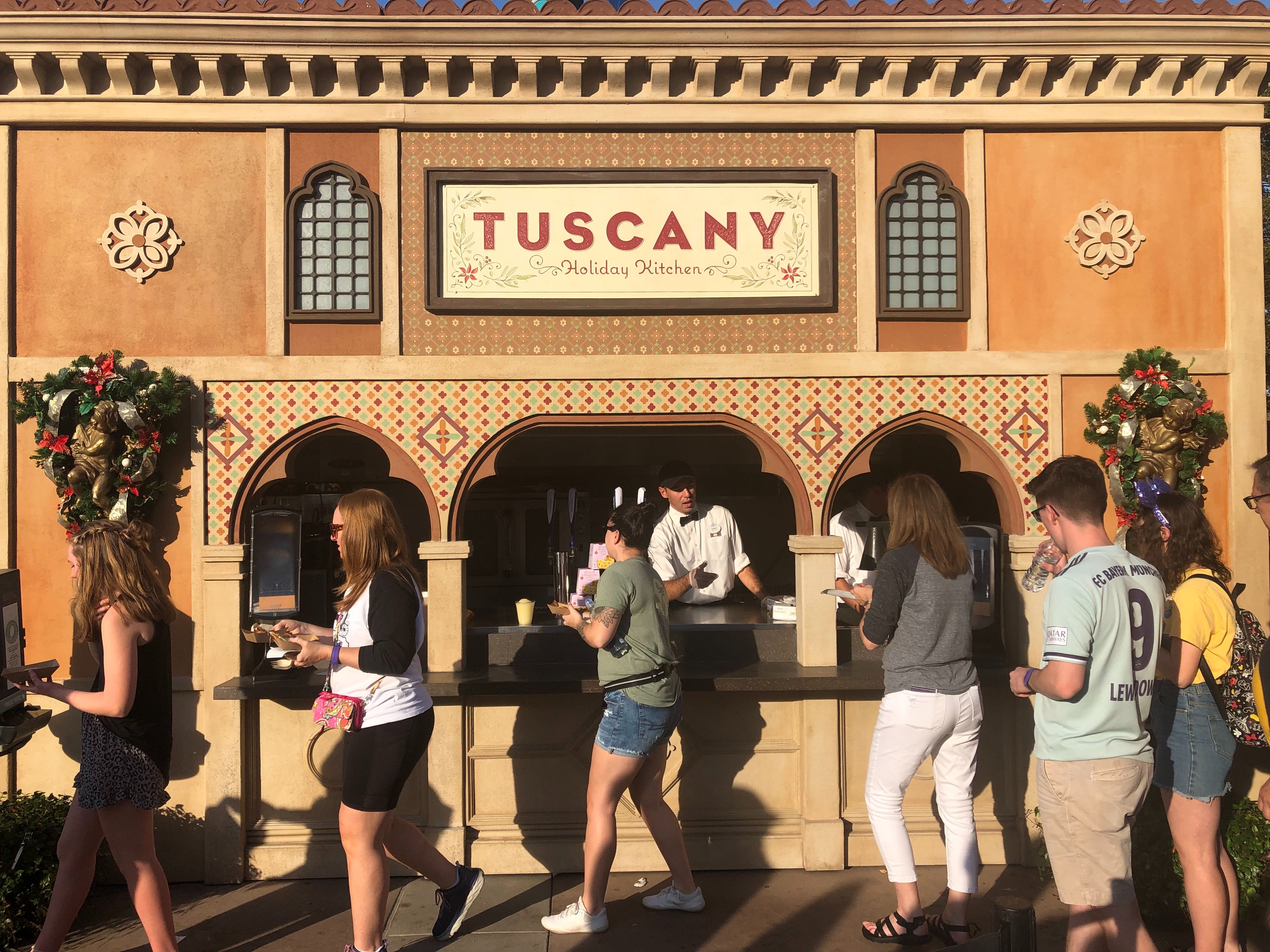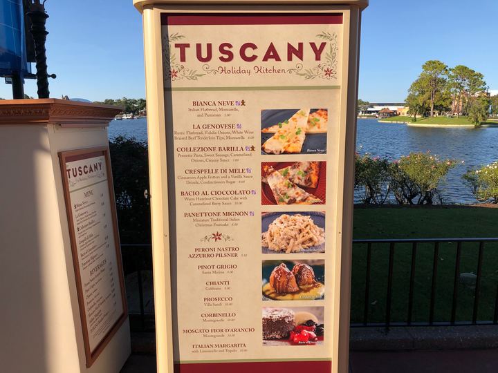 “Mangiare—savor a seasonal take on some of the world’s best-loved food and beverages at the Italy Pavilion!” is how EPCOT is promoting the Tuscany Holiday Kitchen at the 2019 EPCOT International Festival of the Holidays. We’ve never been big fans of any of the food booths for any festival found in the Italy pavilion, but with almost an entirely new menu this year, maybe this year will be different.
