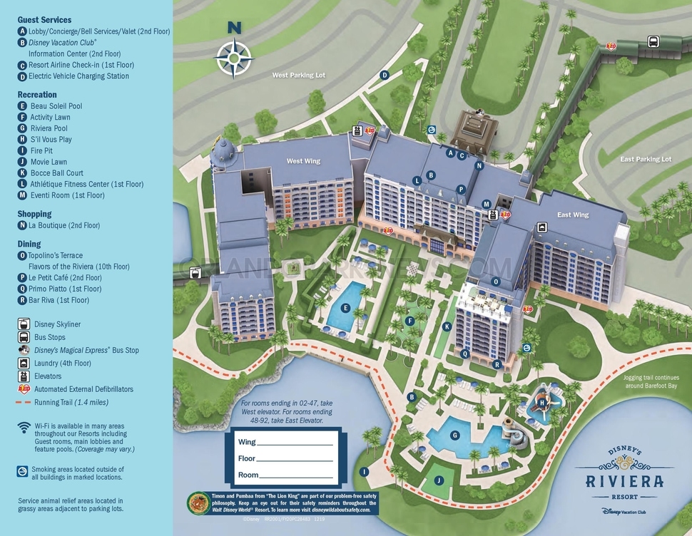 It’s been an exciting day for readers following news about Disney’s Riviera Resort. We recently got an inside look at the resort’s lobby, as well as the new, artist-inspired costumes that the Fab Four will be wearing at the Topolino’s Terrace character breakfast. Now, the official resort map has been released. If you’ve stayed at a Disney Resort hotel before, you’ll recognize this as the map that is given to guests upon check-in, with a section to write in the guests’ wing, floor, and room number.