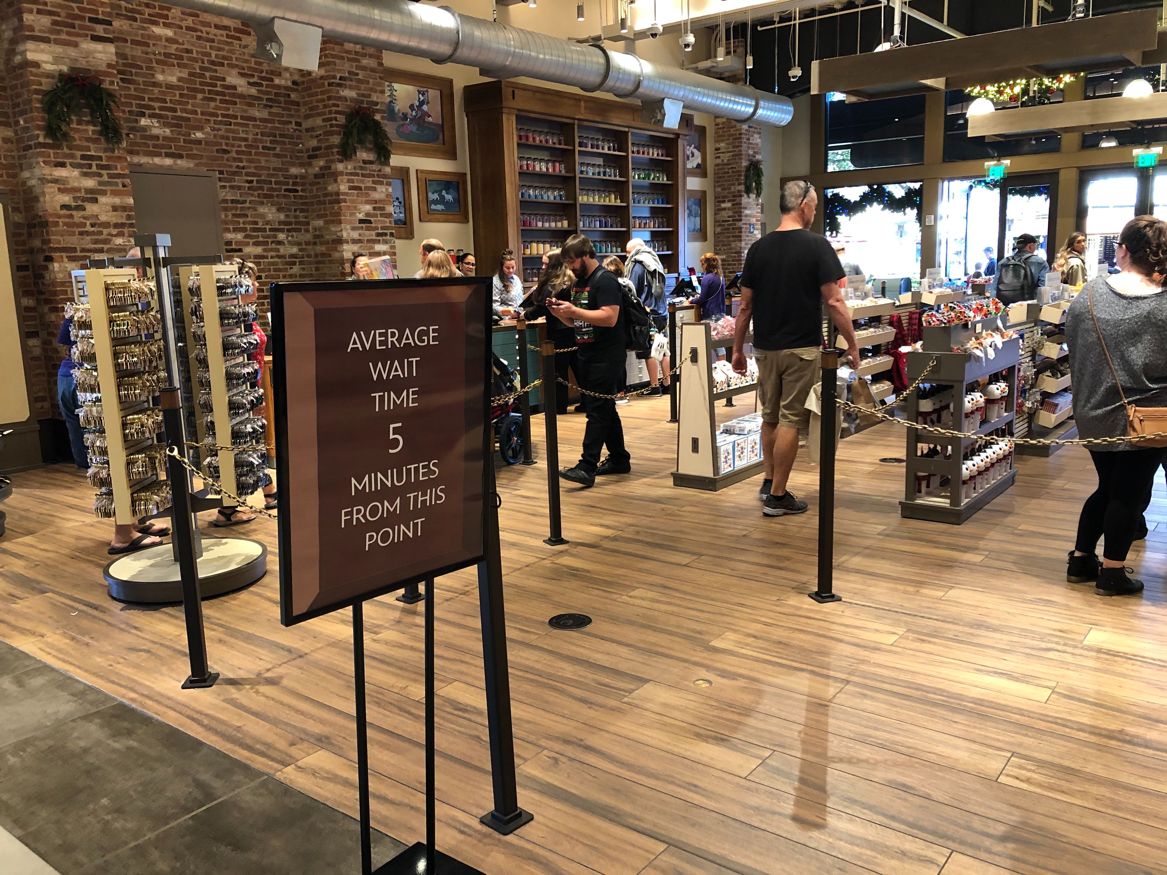 Inside World of Disney, estimated wait time signs have been set up near the entrance of the queue for the register. The stores are very crowded this time of year, and many of the lines to pay are very long. We’re not sure how accurate this is, but it sure feels longer than 5 minutes when the store is crowded and the lines are long.