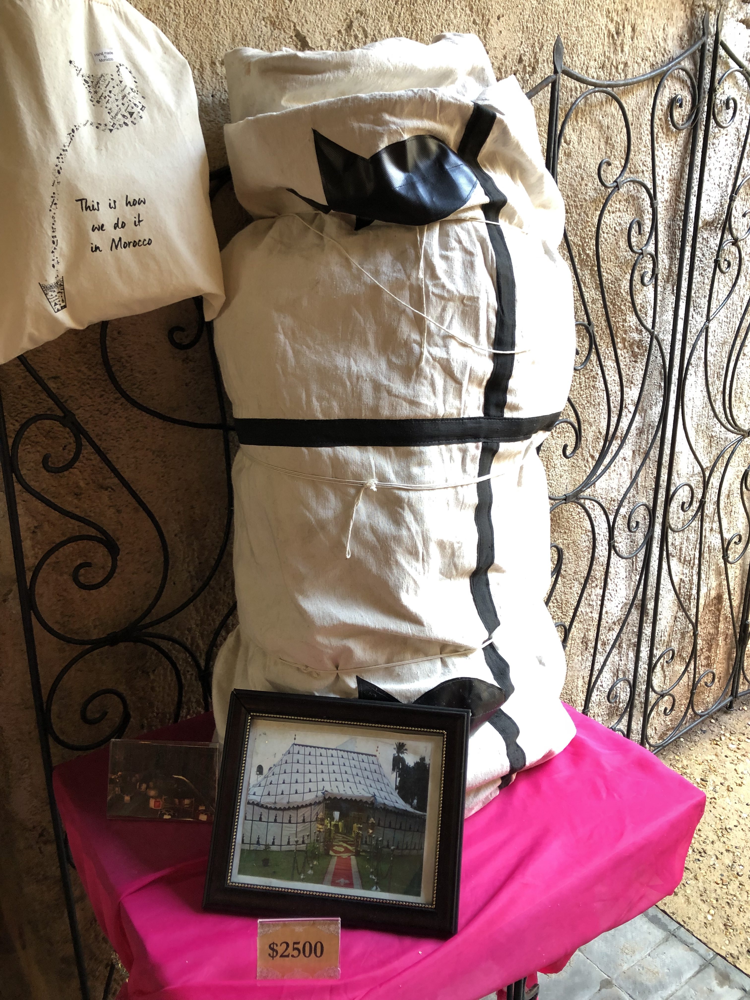 If anyone is looking for an oversized white tent, you can pick this one up in Morocco in the market. It is retailing for $2,500. The photo in the frame shows what the tent looks like when it is set up.