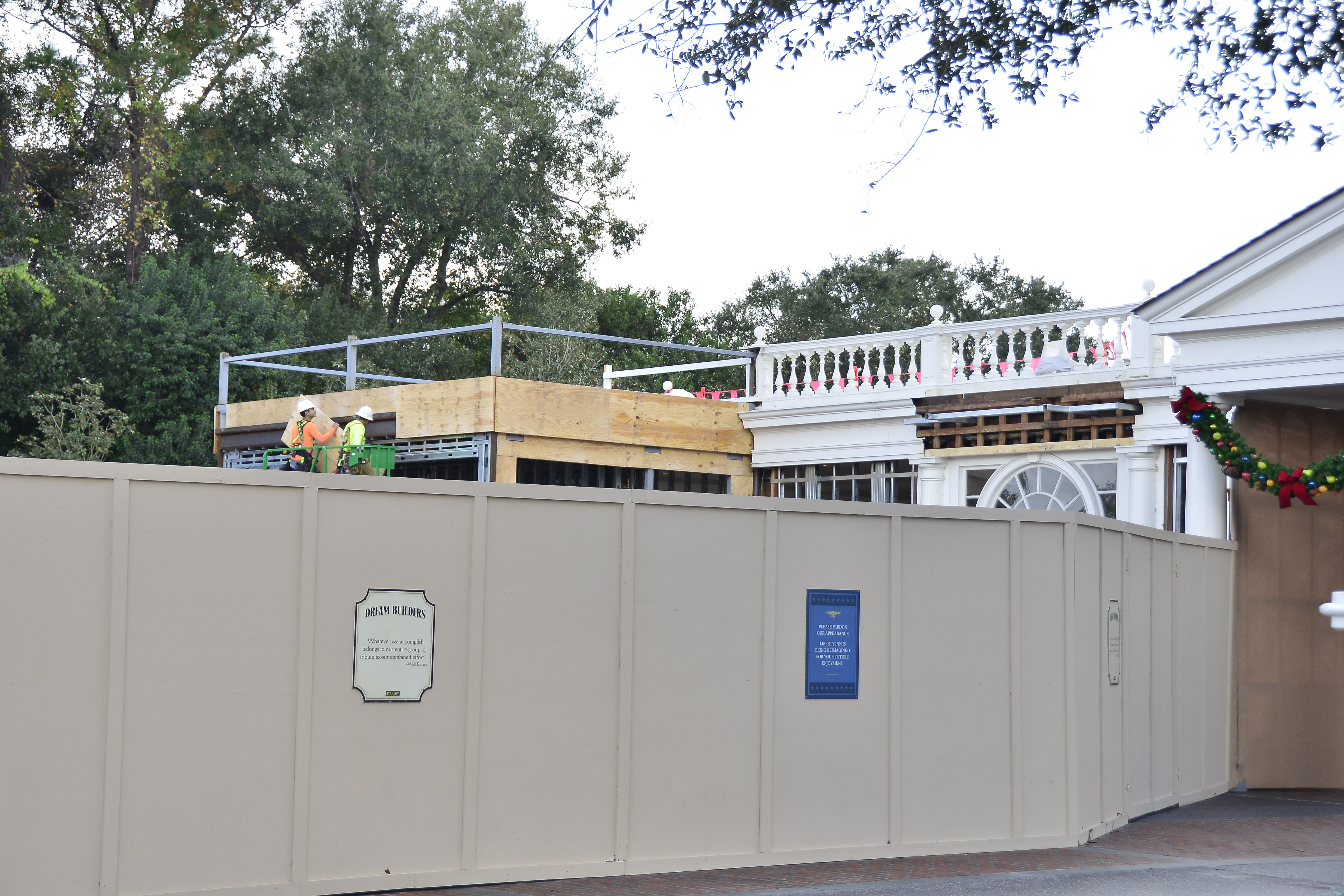 Heritage Manor, the future site of Art of Disney, is still closed off with black curtains blocking the views inside.