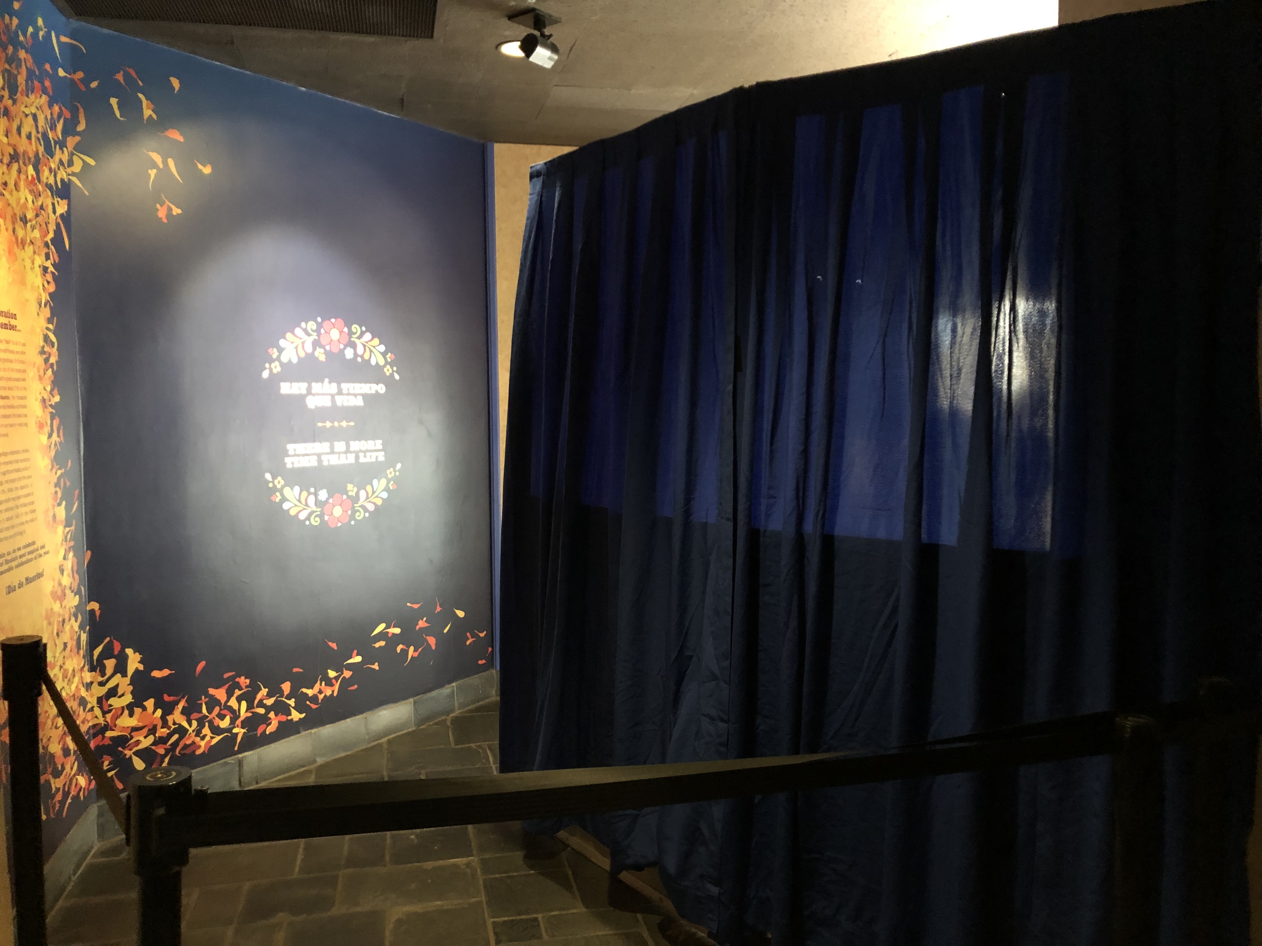 Inside, a blue curtain obstructed the doorway on the other side.